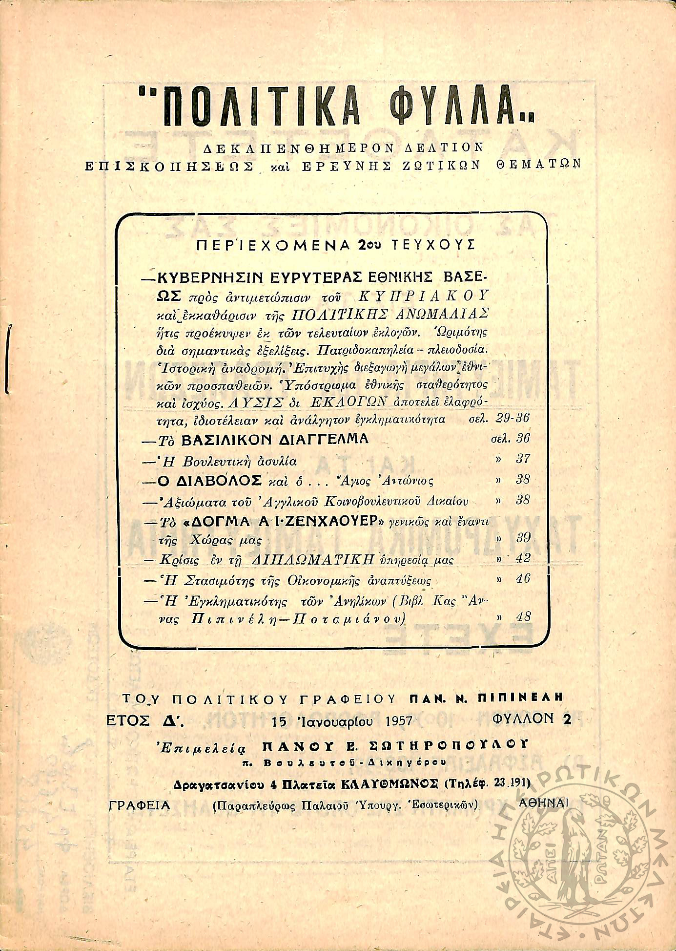 Πολιτικά φύλλα: δεκαπενθήμερον δελτίον επισκοπήσεως και ερεύνης ζωτικών θεμάτων πολιτικών, οικονομικών και κοινωνικών (1957, τεύχ. 2)Έτος Δ΄, τεύχ. 2...