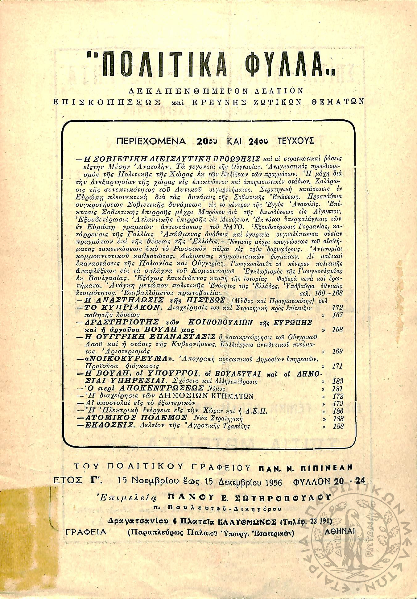 Πολιτικά φύλλα: δεκαπενθήμερον δελτίον επισκοπήσεως και ερεύνης ζωτικών θεμάτων πολιτικών, οικονομικών και κοινωνικών (1956, τεύχ. 20-24)Έτος Γ΄, τεύχ. 20-24...