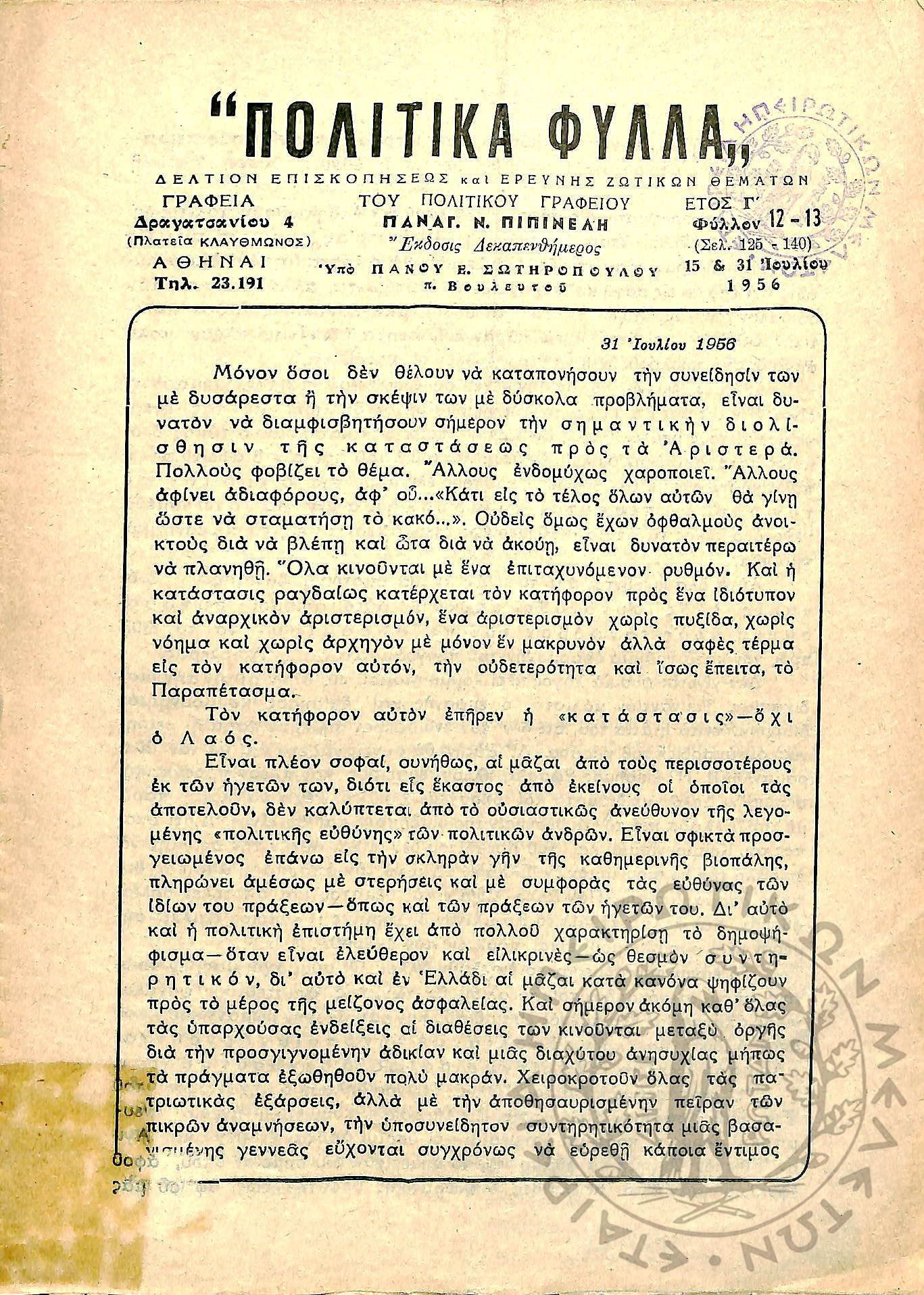 Πολιτικά φύλλα: δεκαπενθήμερον δελτίον επισκοπήσεως και ερεύνης ζωτικών θεμάτων πολιτικών, οικονομικών και κοινωνικών (1956, τεύχ. 12-13)Έτος Γ΄, τεύχ. 12-13...