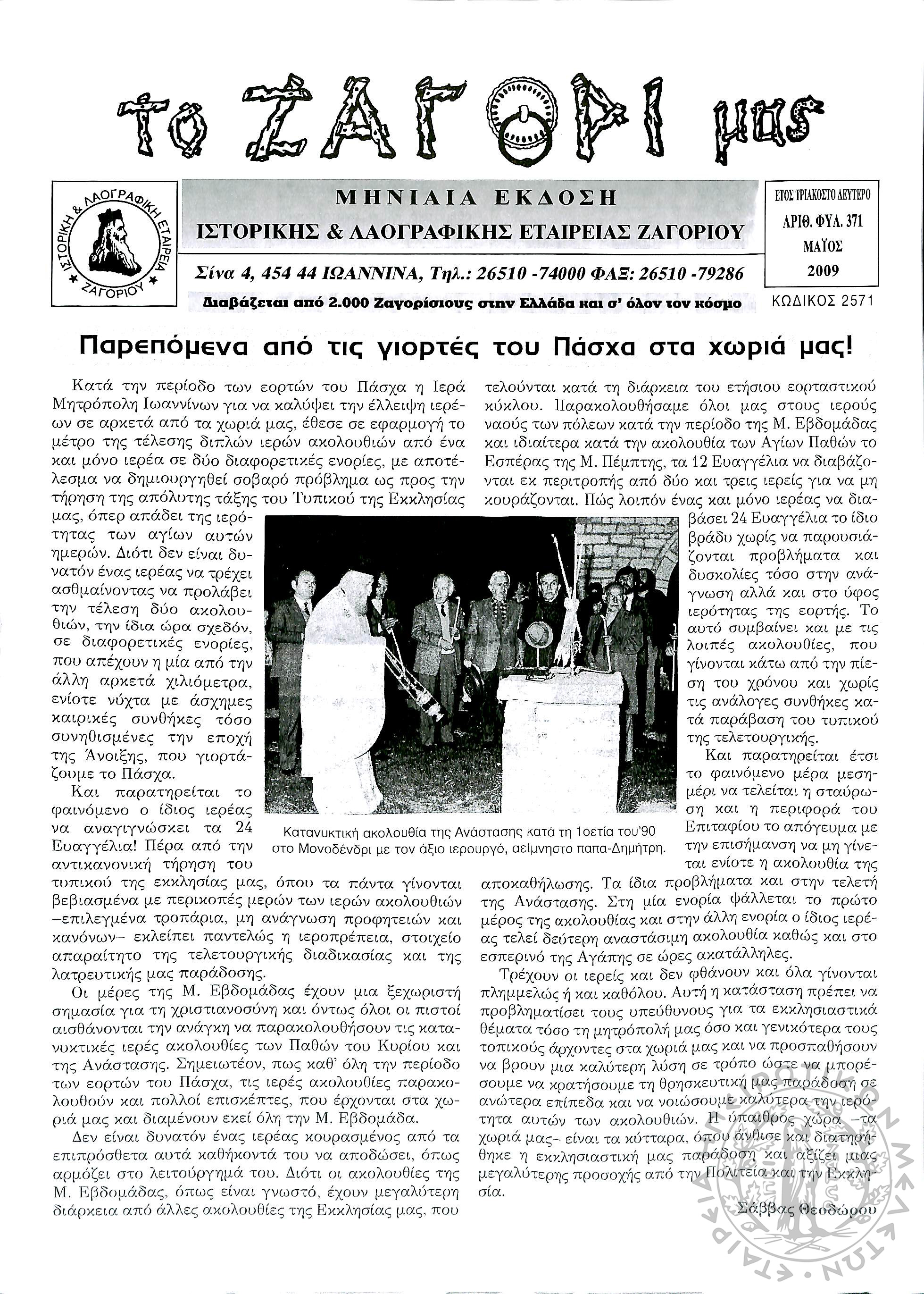 Το Ζαγόρι μας: μηνιαία έκδοση Ιστορικής και Λαογραφικής Εταιρείας Ζαγορίου (φ. 371)Έτος 32, φ. 371...