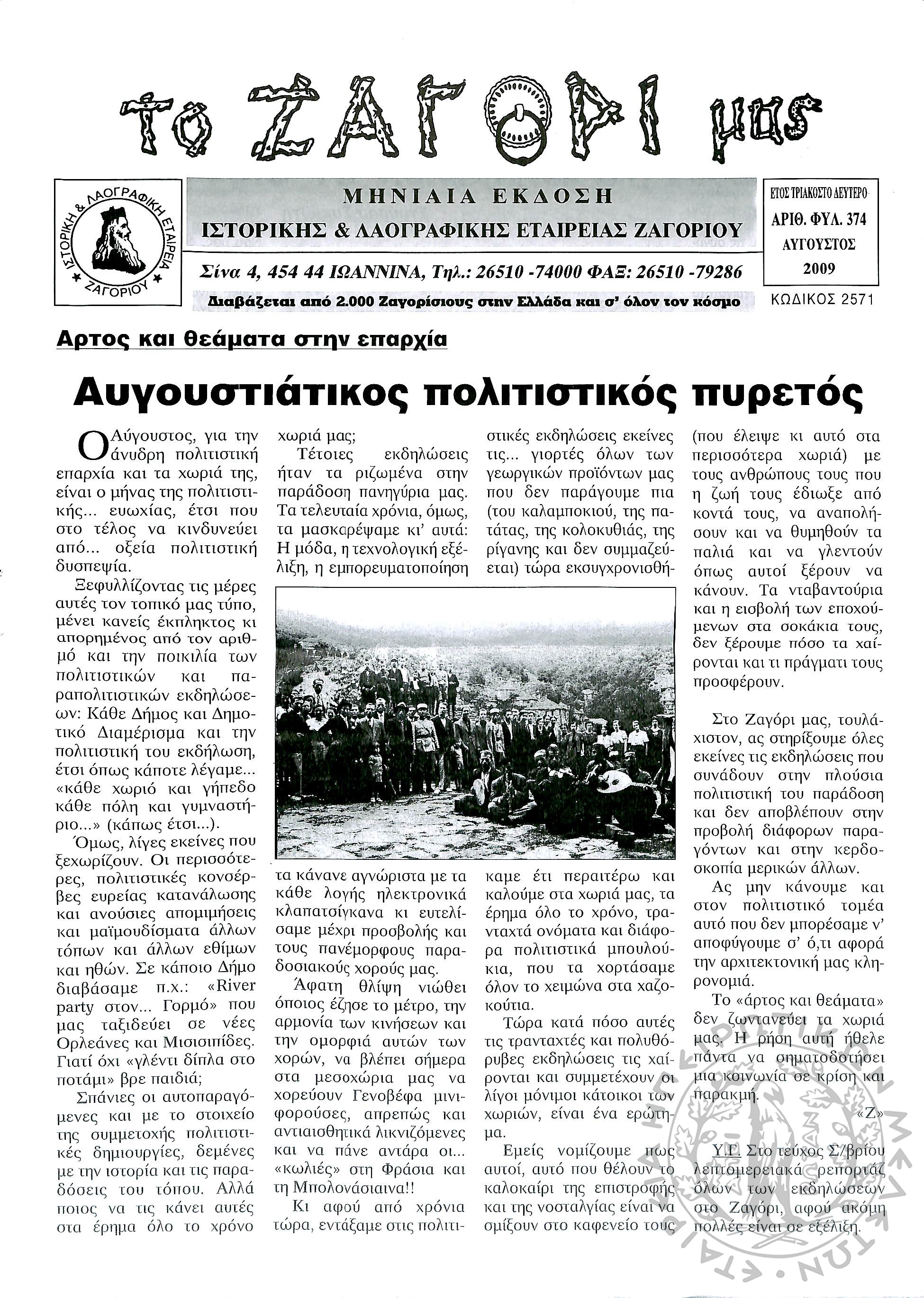 Το Ζαγόρι μας: μηνιαία έκδοση Ιστορικής και Λαογραφικής Εταιρείας Ζαγορίου (φ. 374)Έτος 32, φ. 374...