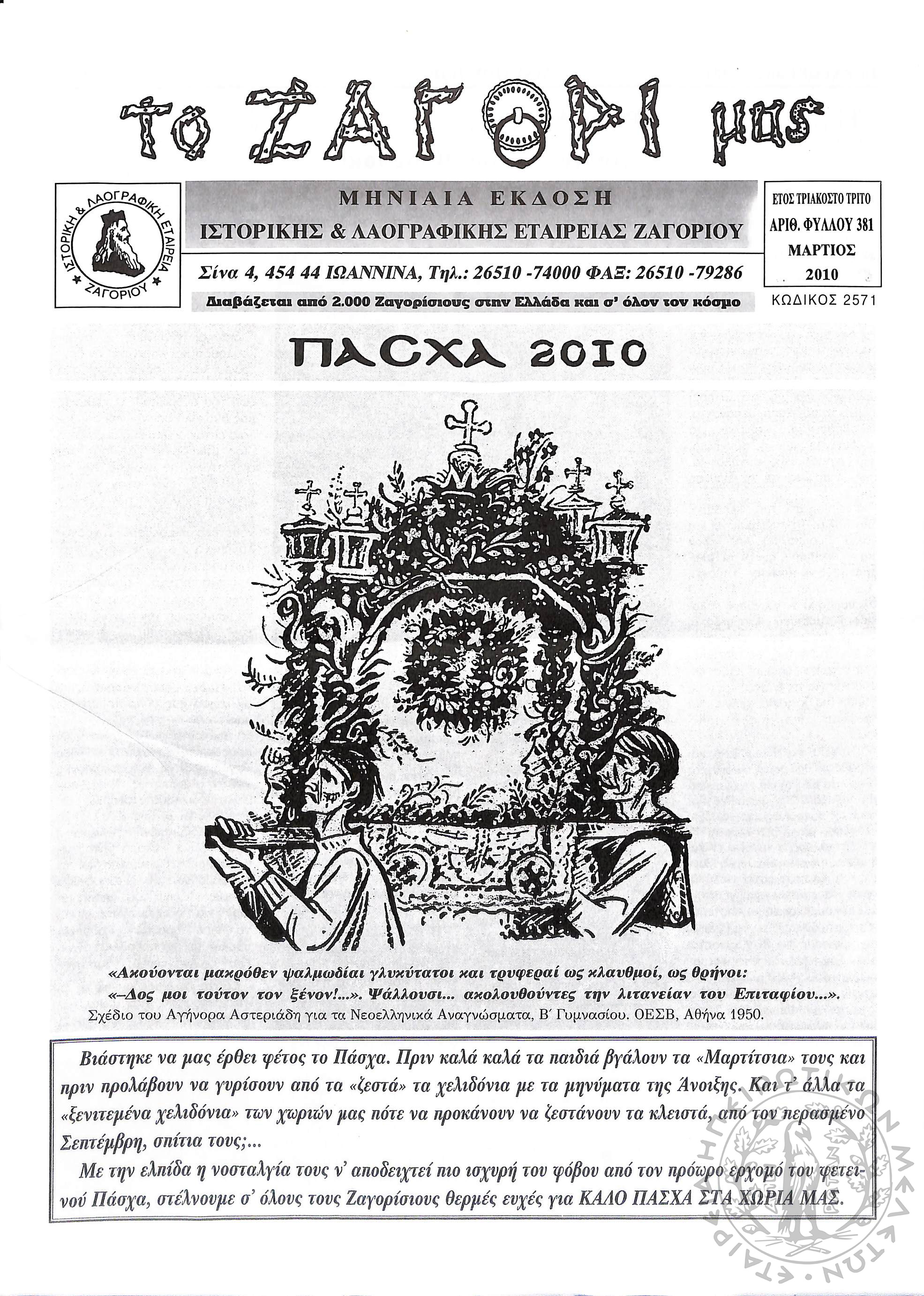 Το Ζαγόρι μας: μηνιαία έκδοση Ιστορικής και Λαογραφικής Εταιρείας Ζαγορίου (φ. 381)Έτος 33, φ. 381...