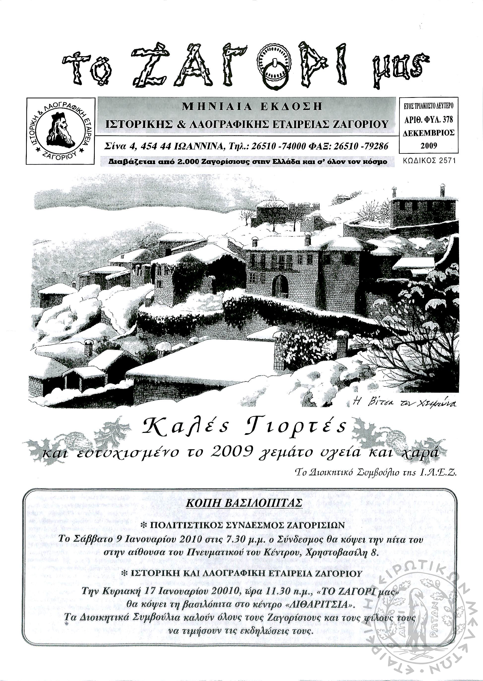 Το Ζαγόρι μας: μηνιαία έκδοση Ιστορικής και Λαογραφικής Εταιρείας Ζαγορίου (φ. 378)Έτος 32, φ. 378...