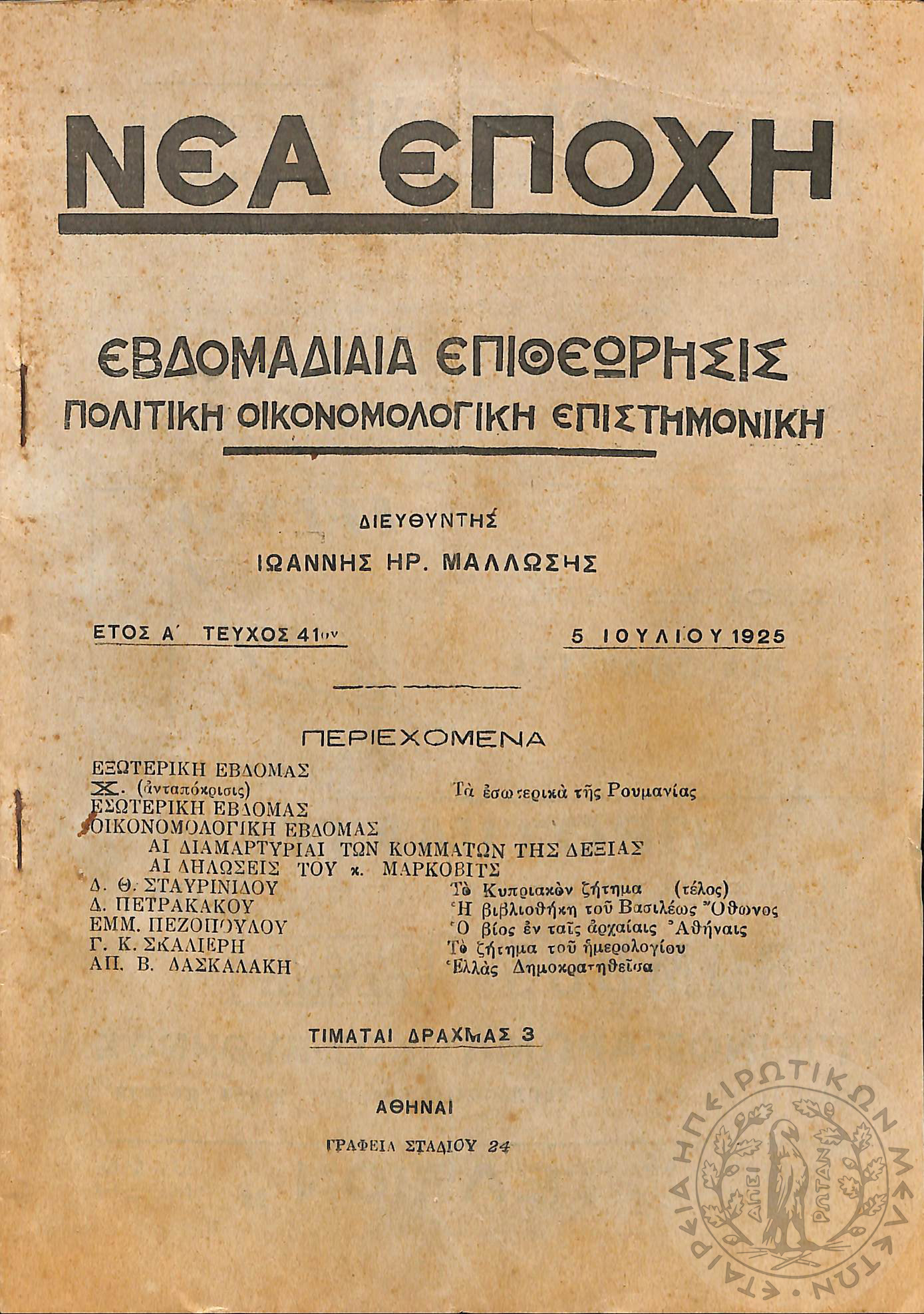 Νέα εποχή: εβδομαδιαία επιθεώρησις πολιτική, οικονομολογική, επιστημονική (τεύχ. 41)Έτος Α΄, τεύχ. 41...