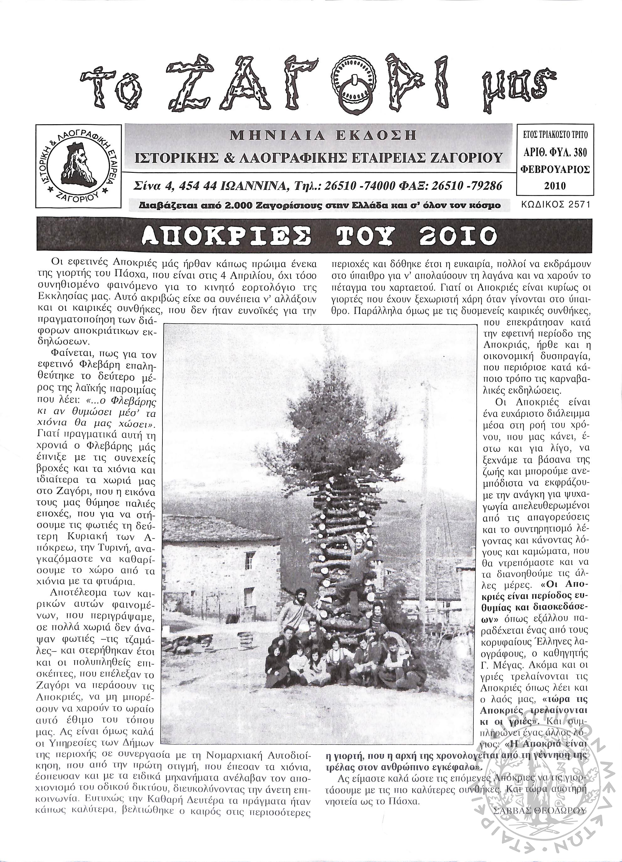 Το Ζαγόρι μας: μηνιαία έκδοση Ιστορικής και Λαογραφικής Εταιρείας Ζαγορίου (φ. 380)Έτος 33, φ. 380...