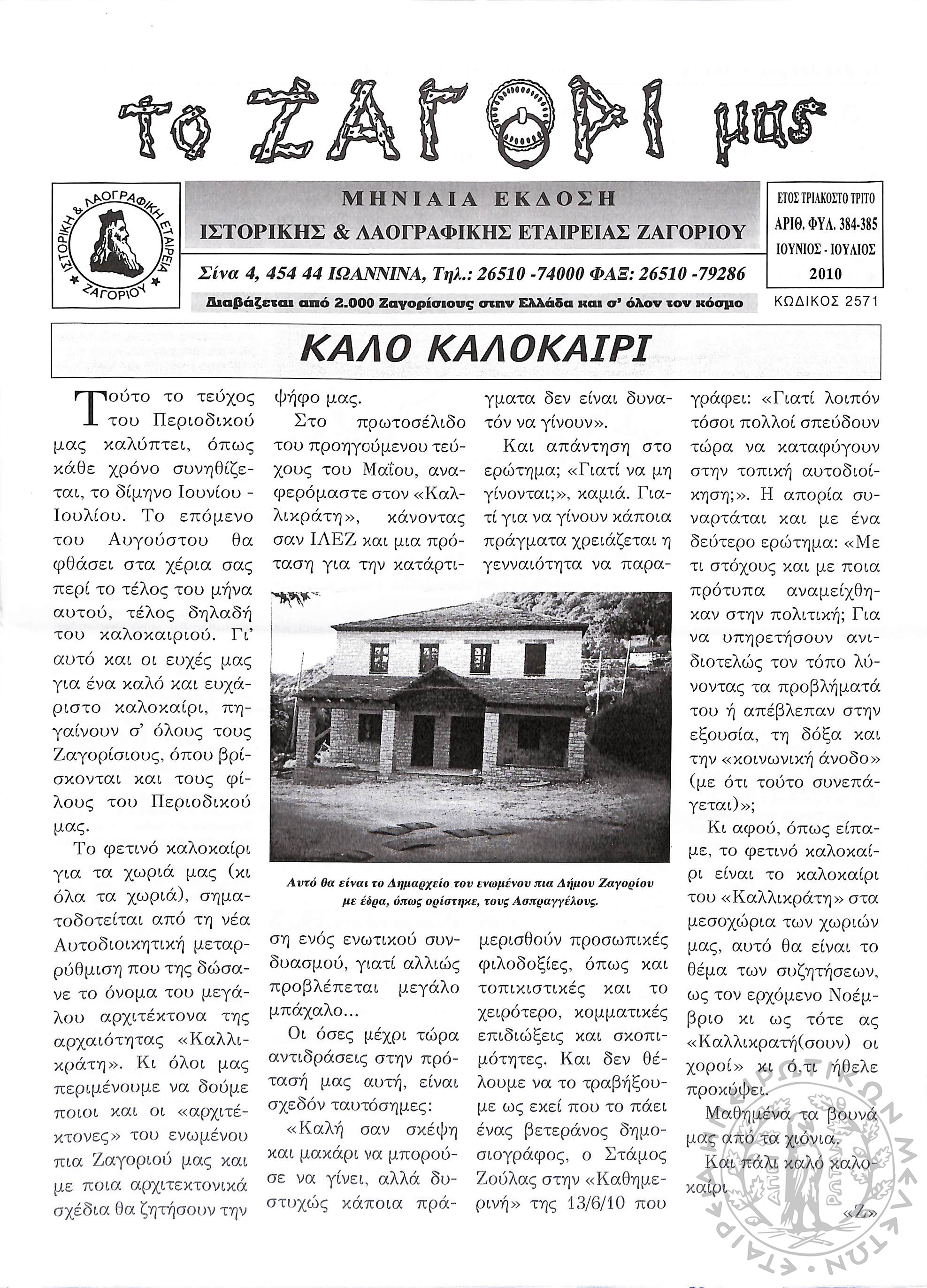 Το Ζαγόρι μας: μηνιαία έκδοση Ιστορικής και Λαογραφικής Εταιρείας Ζαγορίου (φ. 384-385)Έτος 33, φ. 384-385...