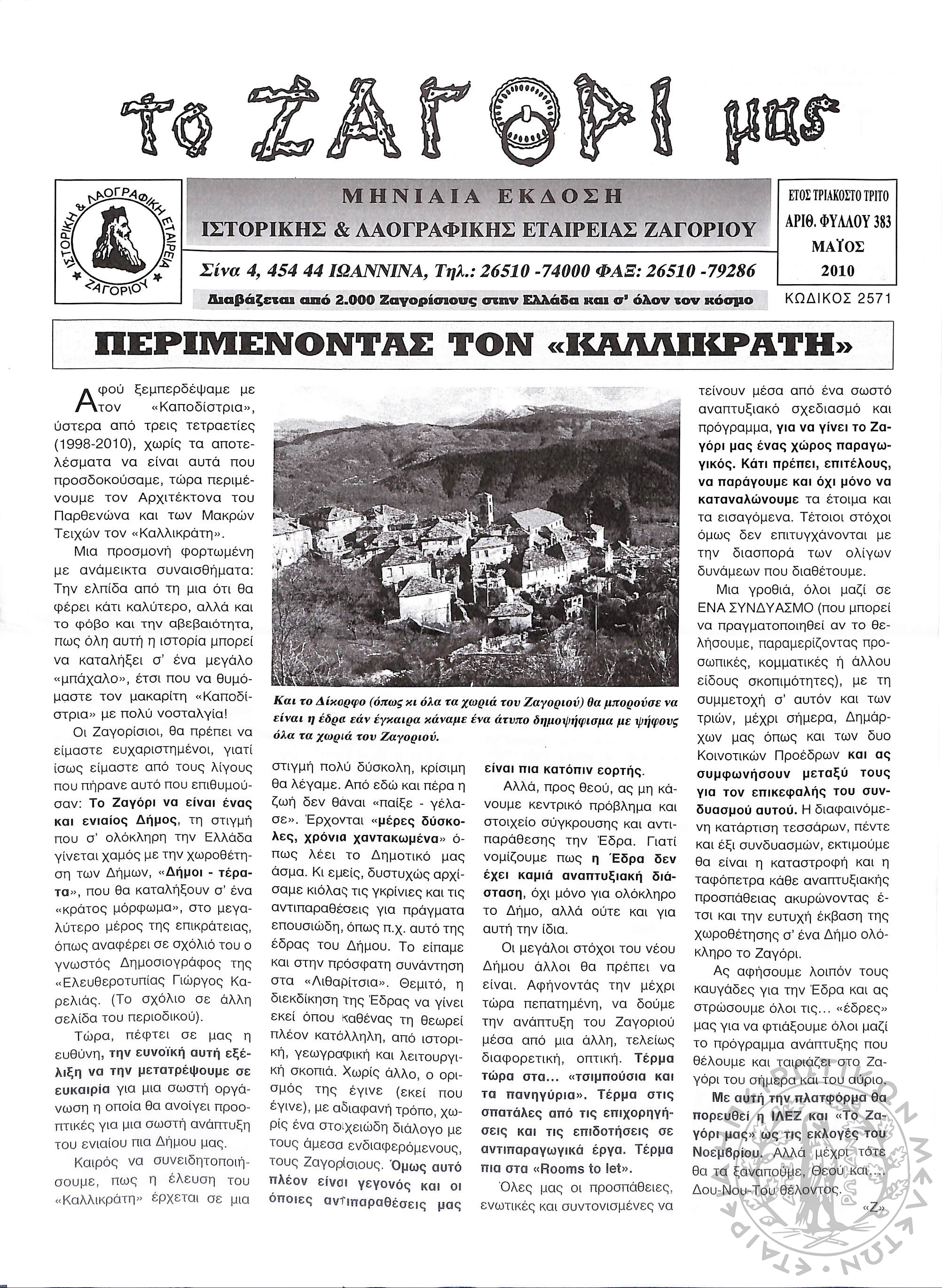 Το Ζαγόρι μας: μηνιαία έκδοση Ιστορικής και Λαογραφικής Εταιρείας Ζαγορίου (φ. 383)Έτος 33, φ. 383...