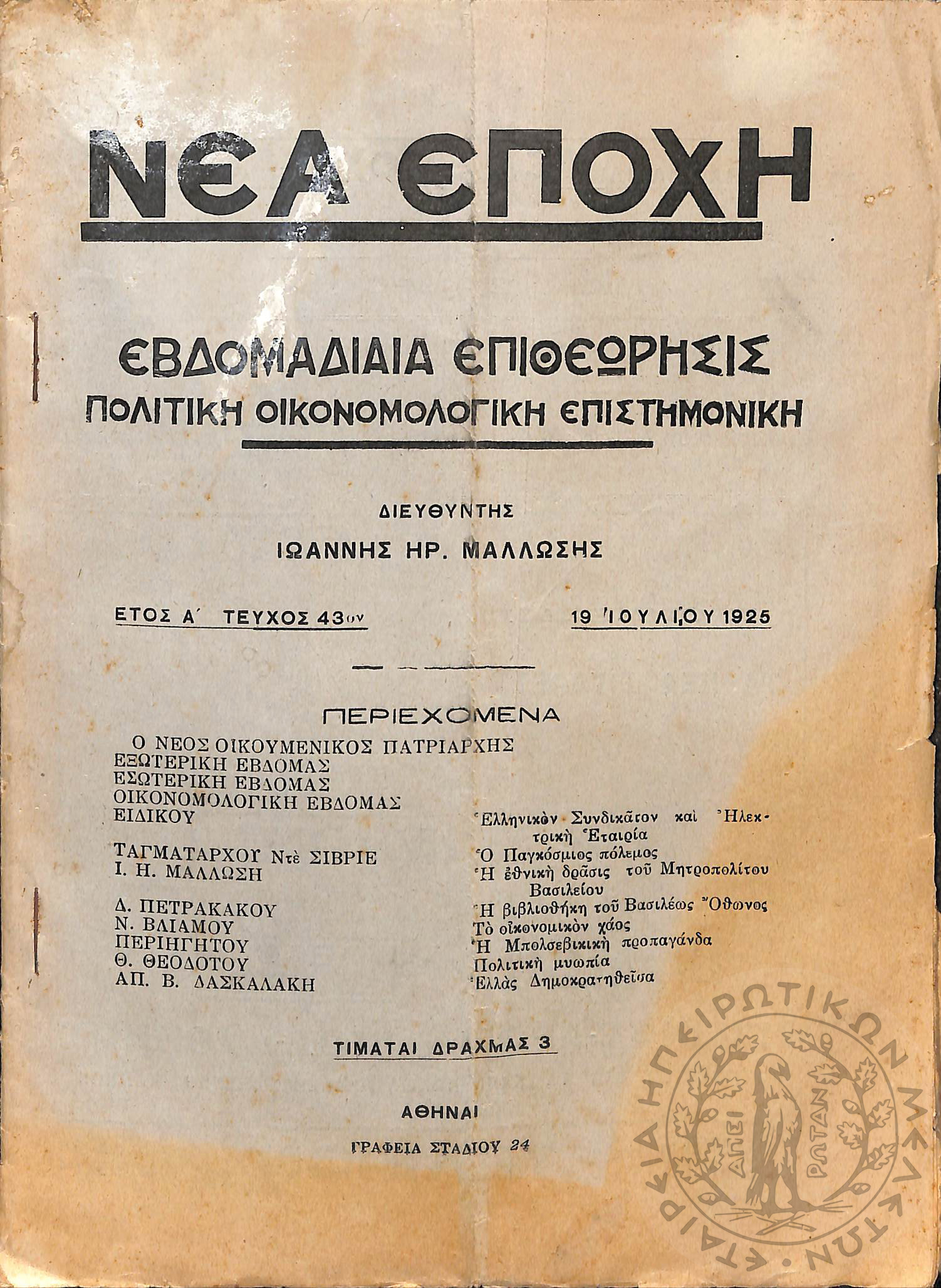 Νέα εποχή: εβδομαδιαία επιθεώρησις πολιτική, οικονομολογική, επιστημονική (τεύχ. 43)Έτος Α΄, τεύχ. 43...