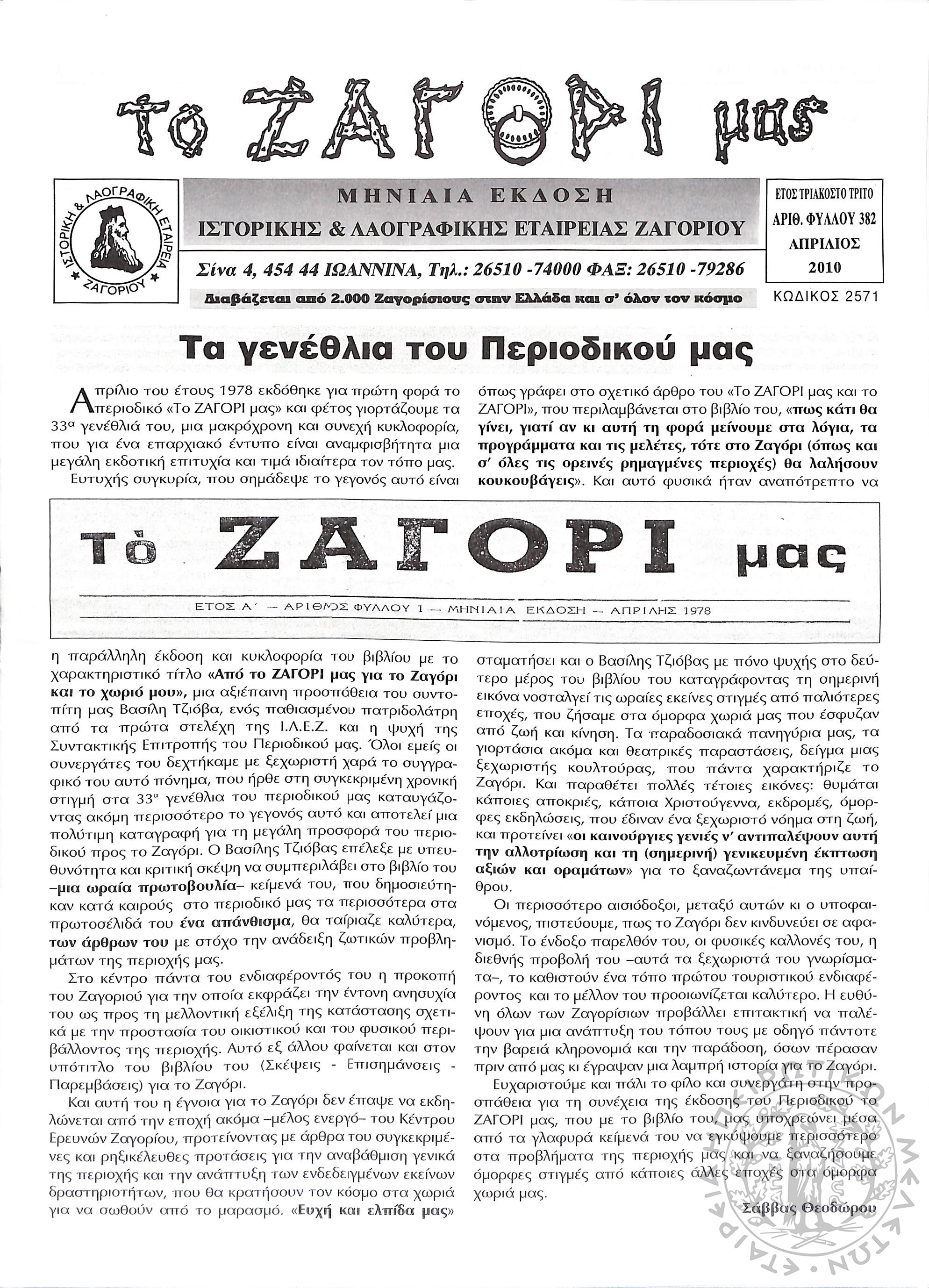 Το Ζαγόρι μας: μηνιαία έκδοση Ιστορικής και Λαογραφικής Εταιρείας Ζαγορίου (φ. 382)Έτος 33, φ. 382...