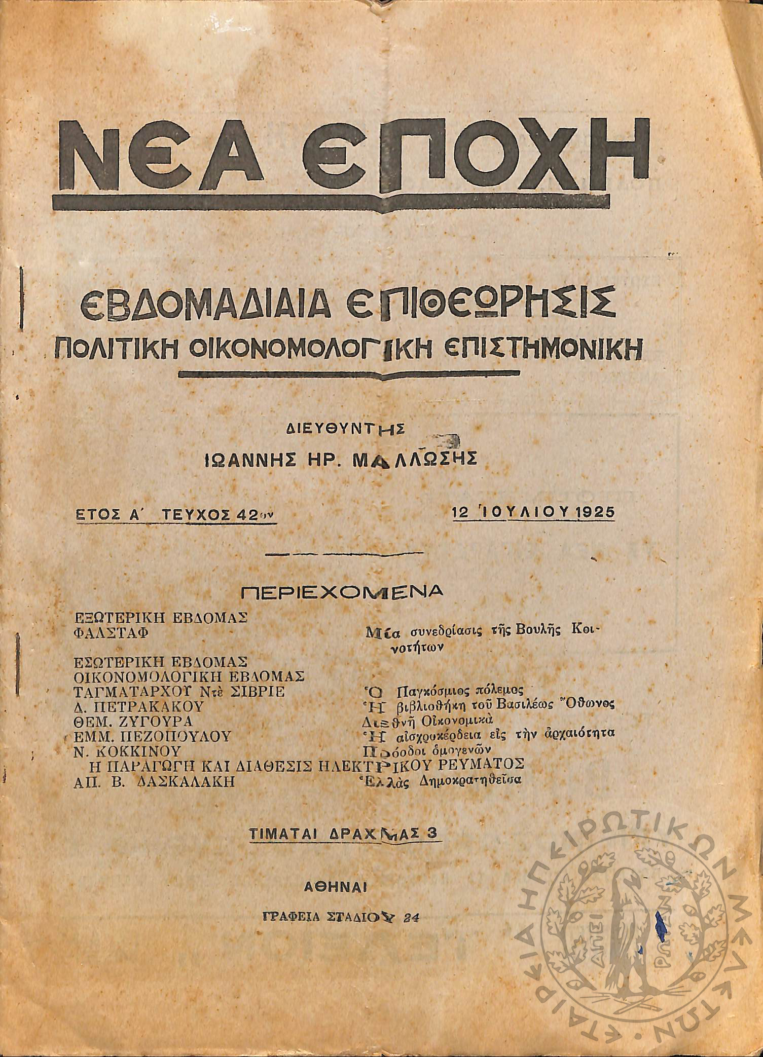 Νέα εποχή: εβδομαδιαία επιθεώρησις πολιτική, οικονομολογική, επιστημονική (τεύχ. 42)Έτος Α΄, τεύχ. 42...