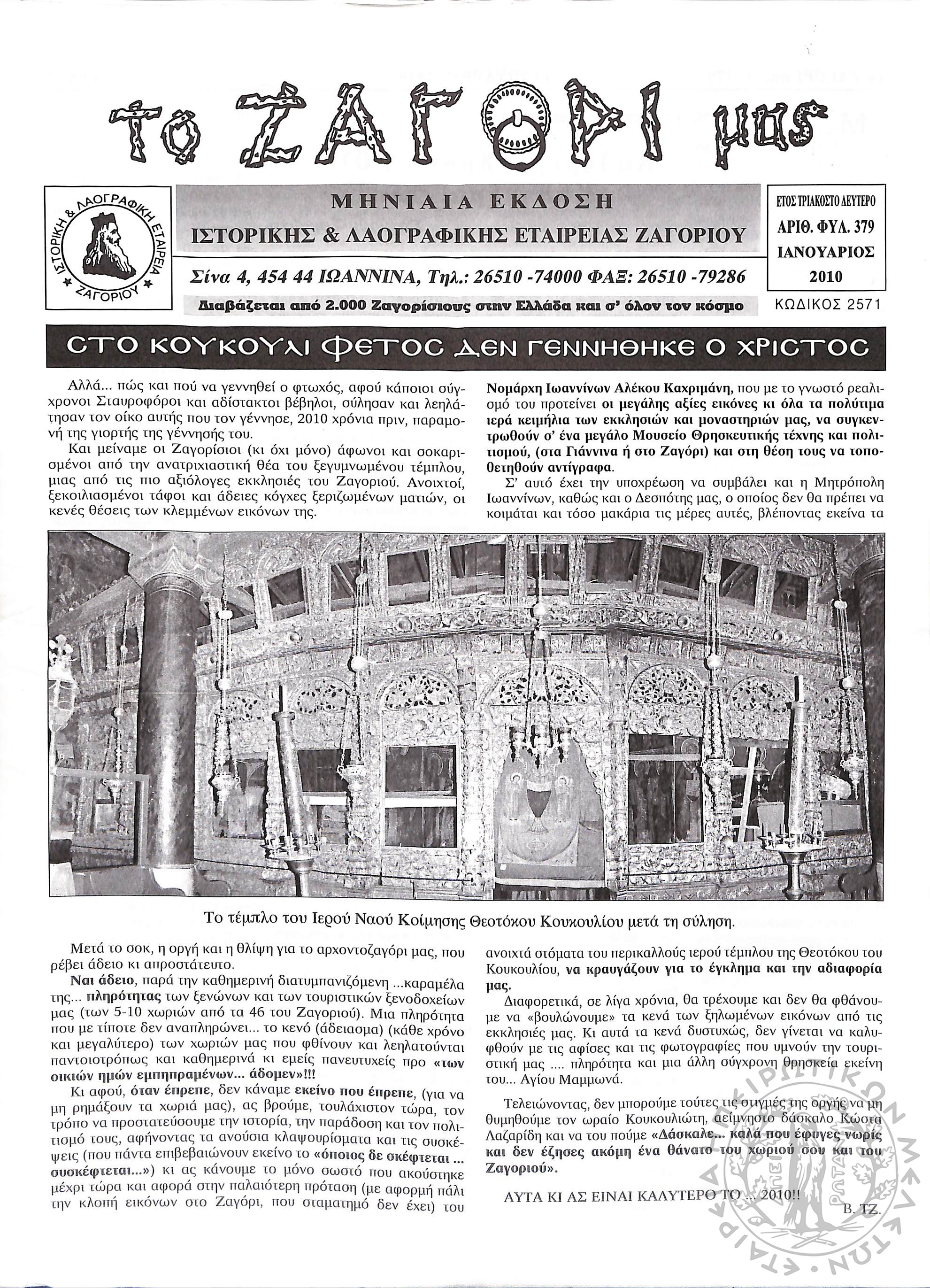 Το Ζαγόρι μας: μηνιαία έκδοση Ιστορικής και Λαογραφικής Εταιρείας Ζαγορίου (φ. 379)Έτος 32, φ. 379...