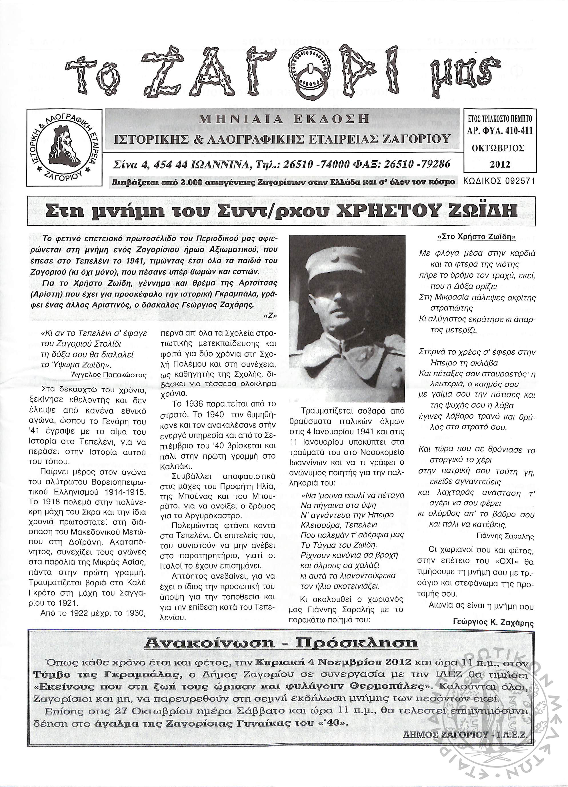Το Ζαγόρι μας: μηνιαία έκδοση Ιστορικής και Λαογραφικής Εταιρείας Ζαγορίου (φ. 412)Έτος 35, φ. 412 [410-411]...