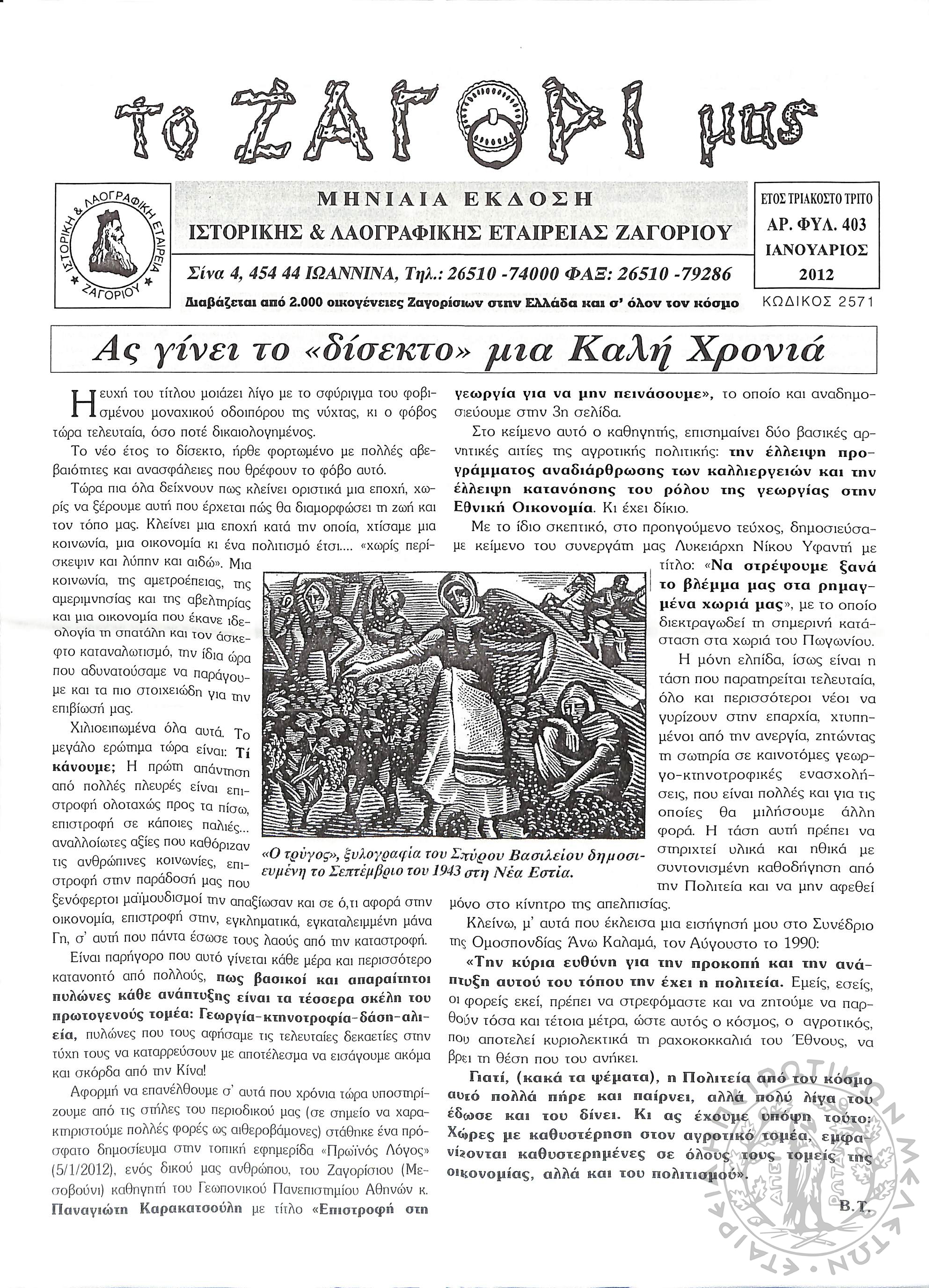 Το Ζαγόρι μας: μηνιαία έκδοση Ιστορικής και Λαογραφικής Εταιρείας Ζαγορίου (φ. 403)Έτος 33, φ. 403...