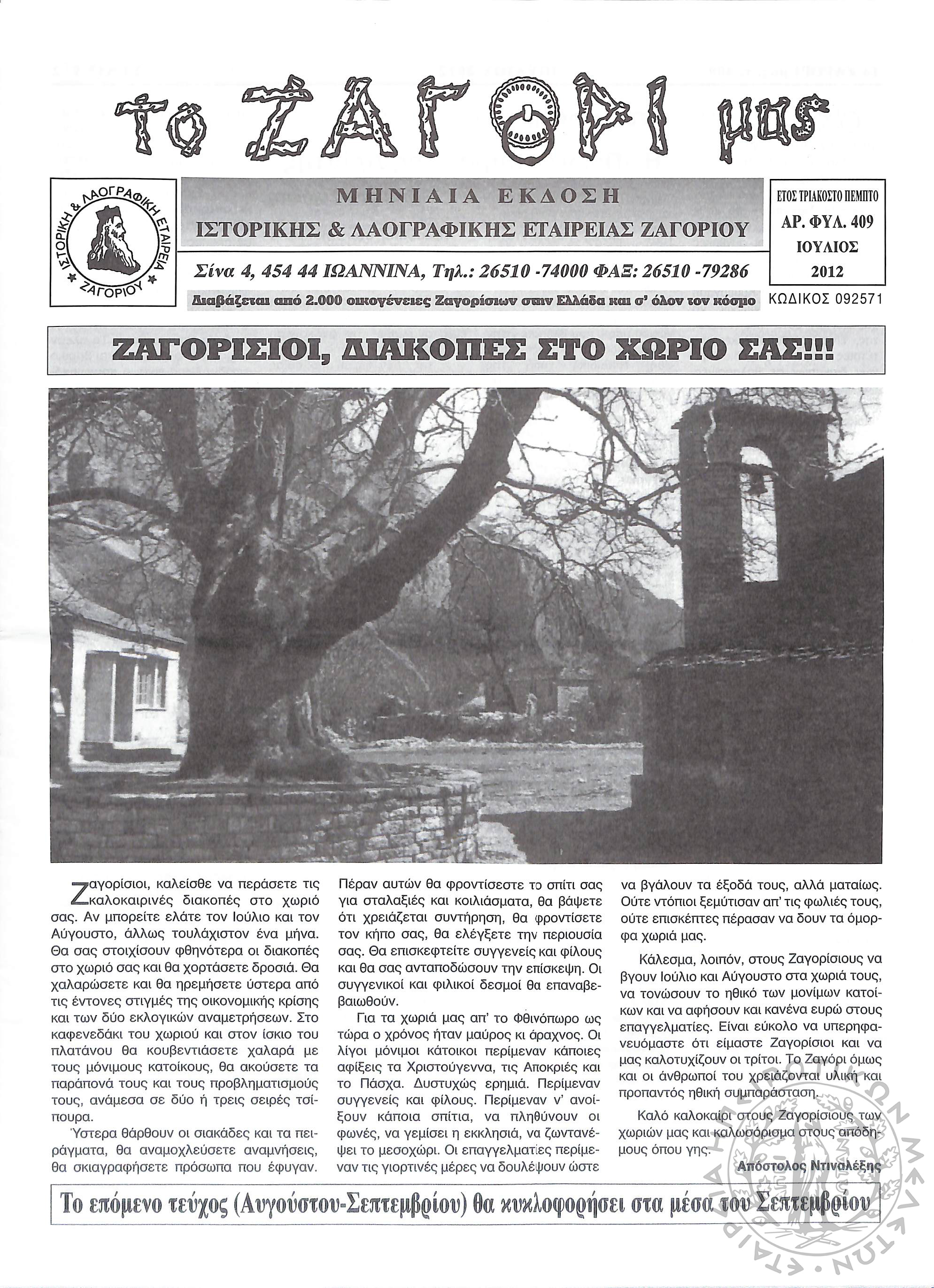 Το Ζαγόρι μας: μηνιαία έκδοση Ιστορικής και Λαογραφικής Εταιρείας Ζαγορίου (φ. 409)Έτος 35, φ. 409...