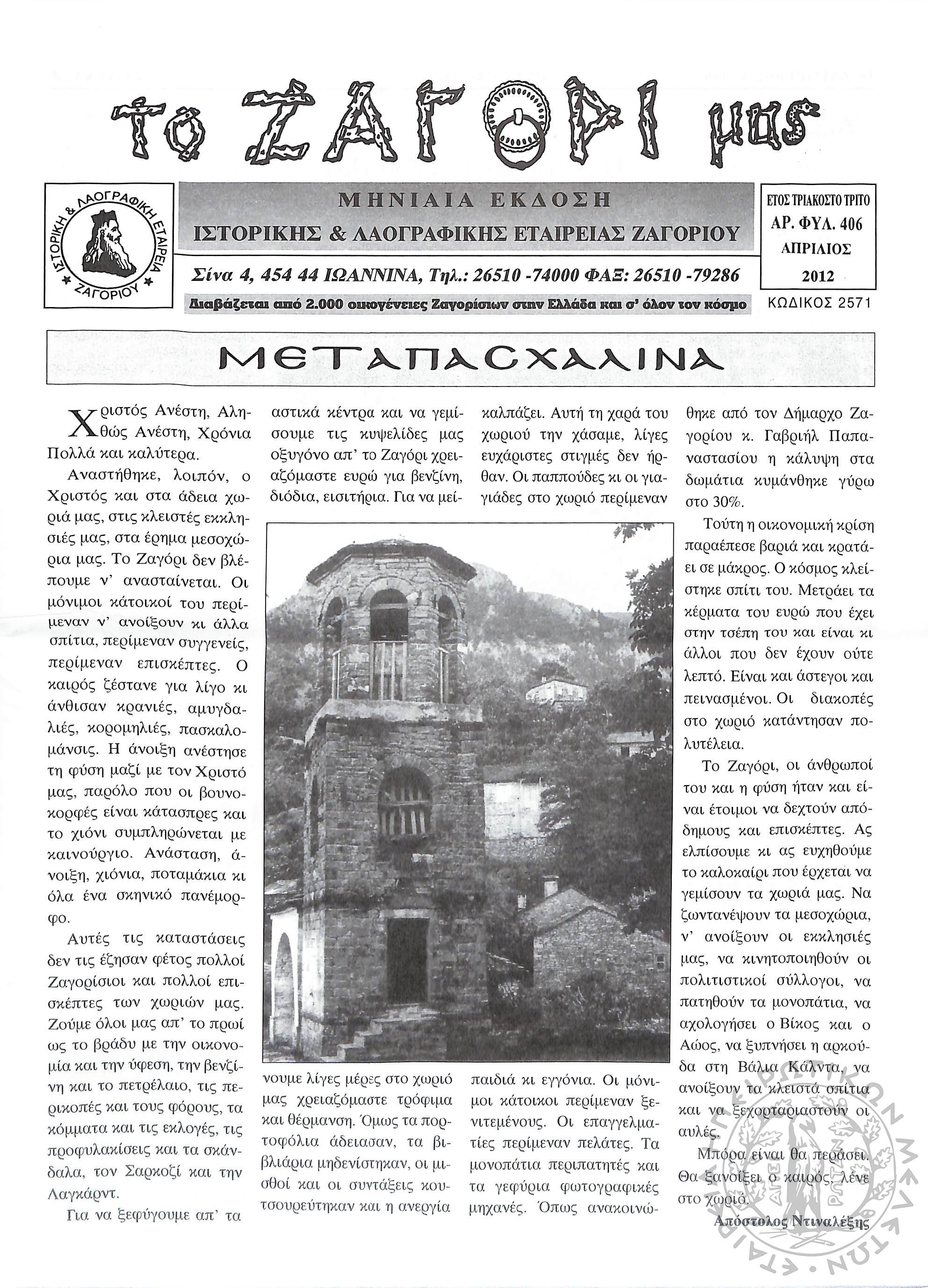 Το Ζαγόρι μας: μηνιαία έκδοση Ιστορικής και Λαογραφικής Εταιρείας Ζαγορίου (φ. 406)Έτος 33, φ. 406...