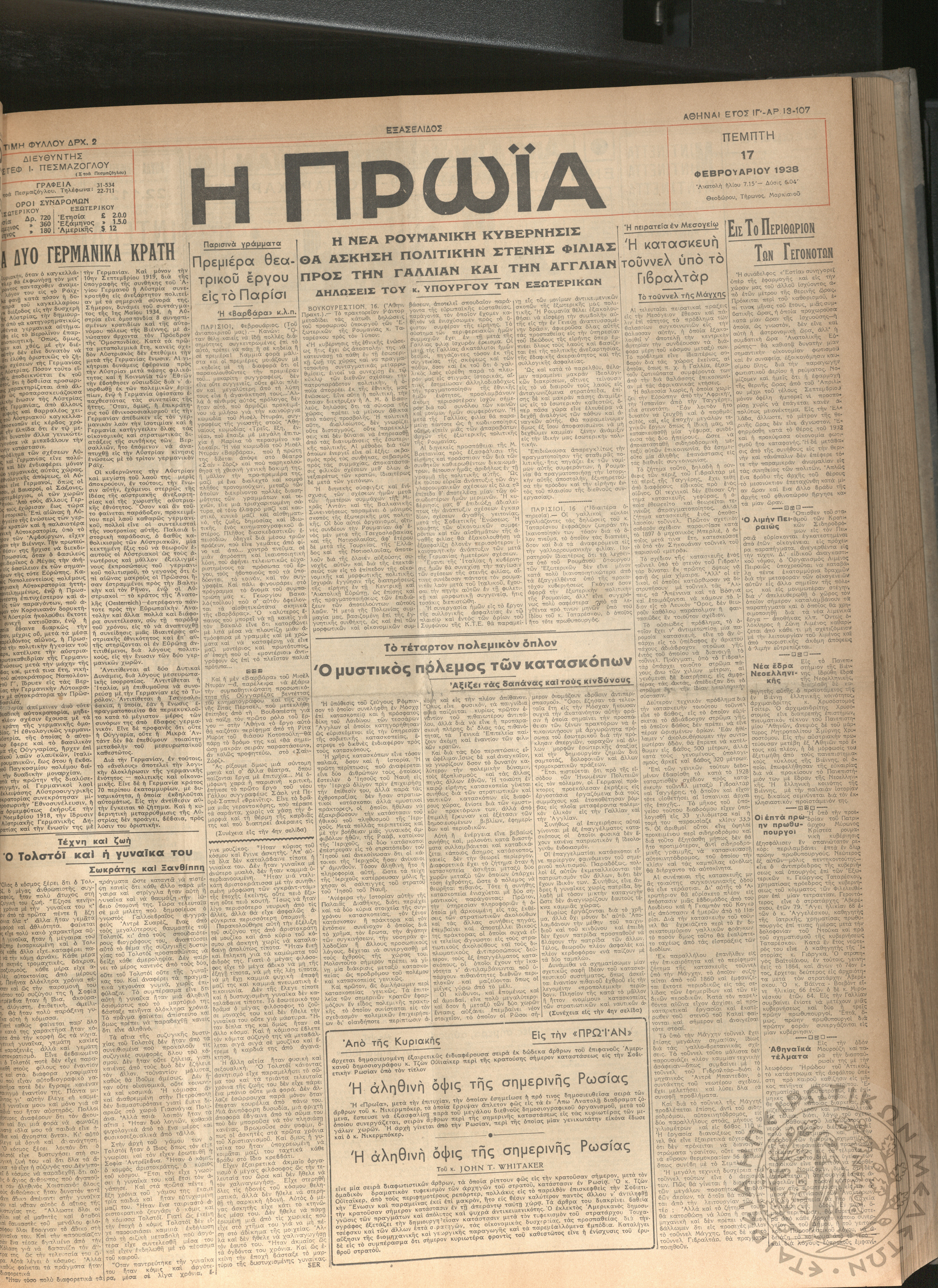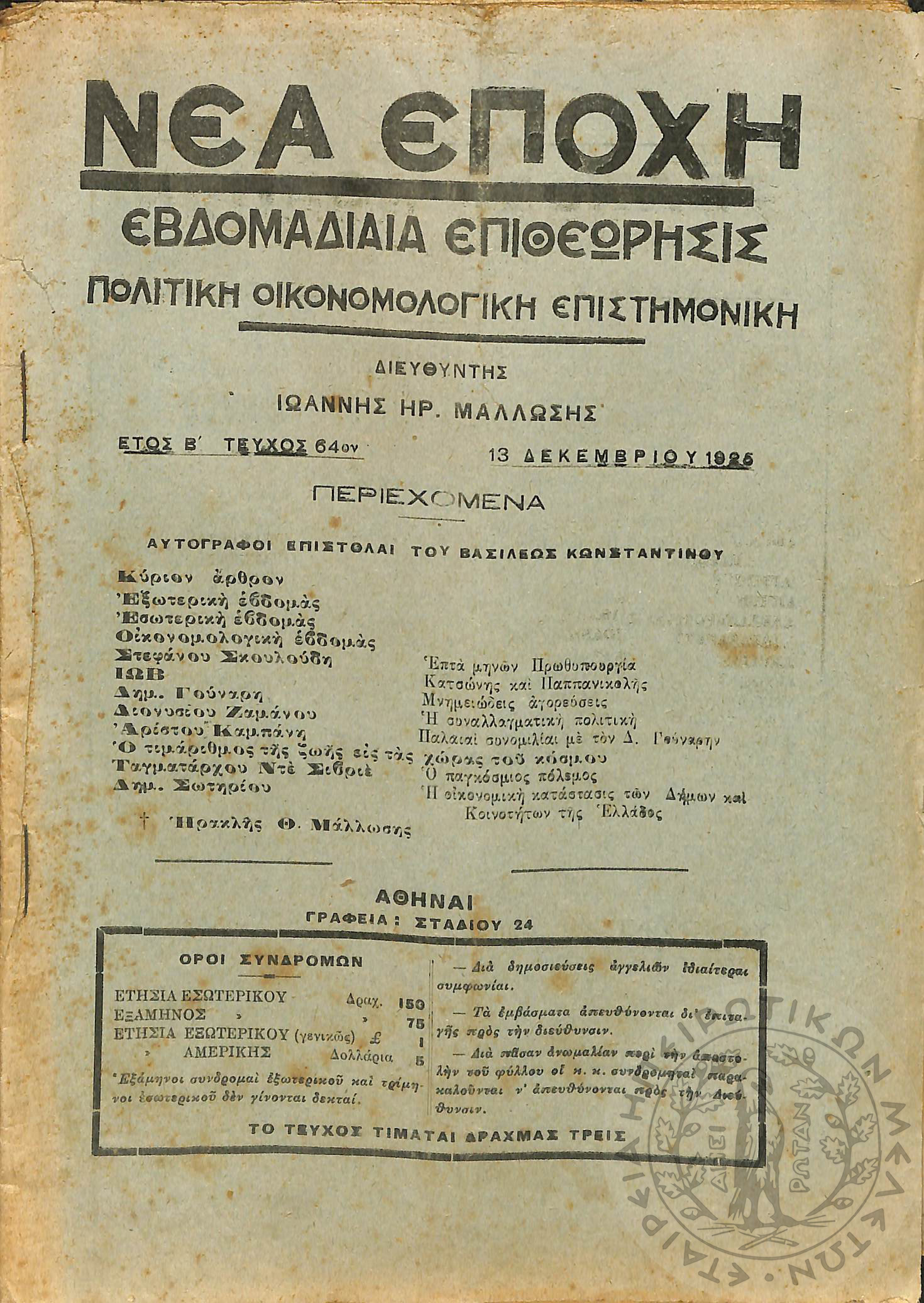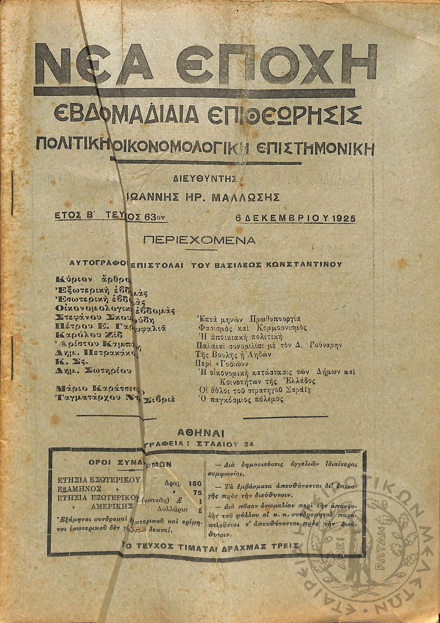 Νέα εποχή: εβδομαδιαία επιθεώρησις πολιτική, οικονομολογική, επιστημονική (τεύχ. 63)Έτος Β΄, τεύχ. 63...