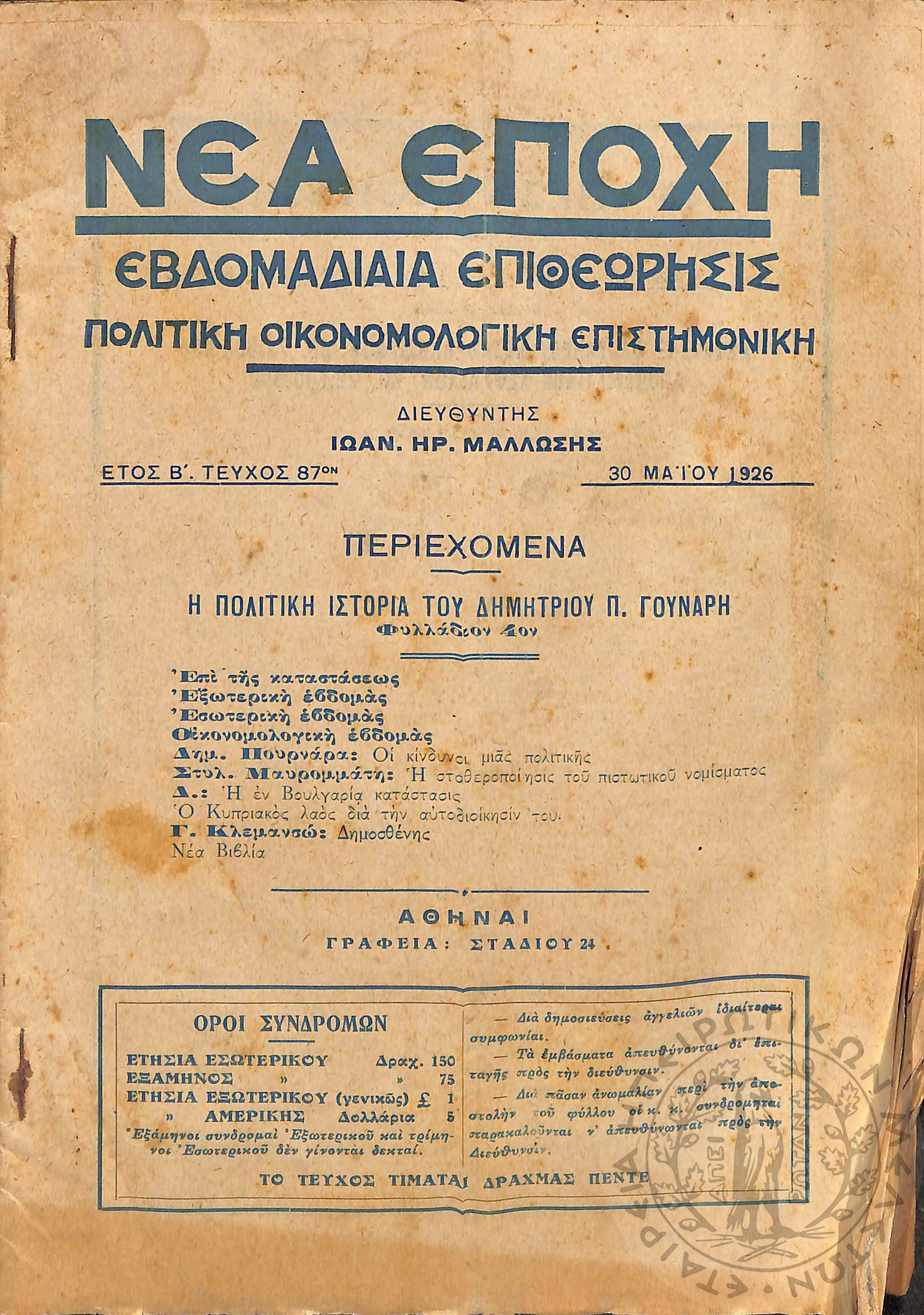 Νέα εποχή: εβδομαδιαία επιθεώρησις πολιτική, οικονομολογική, επιστημονική (τεύχ. 87)Έτος Β΄, τεύχ. 87...