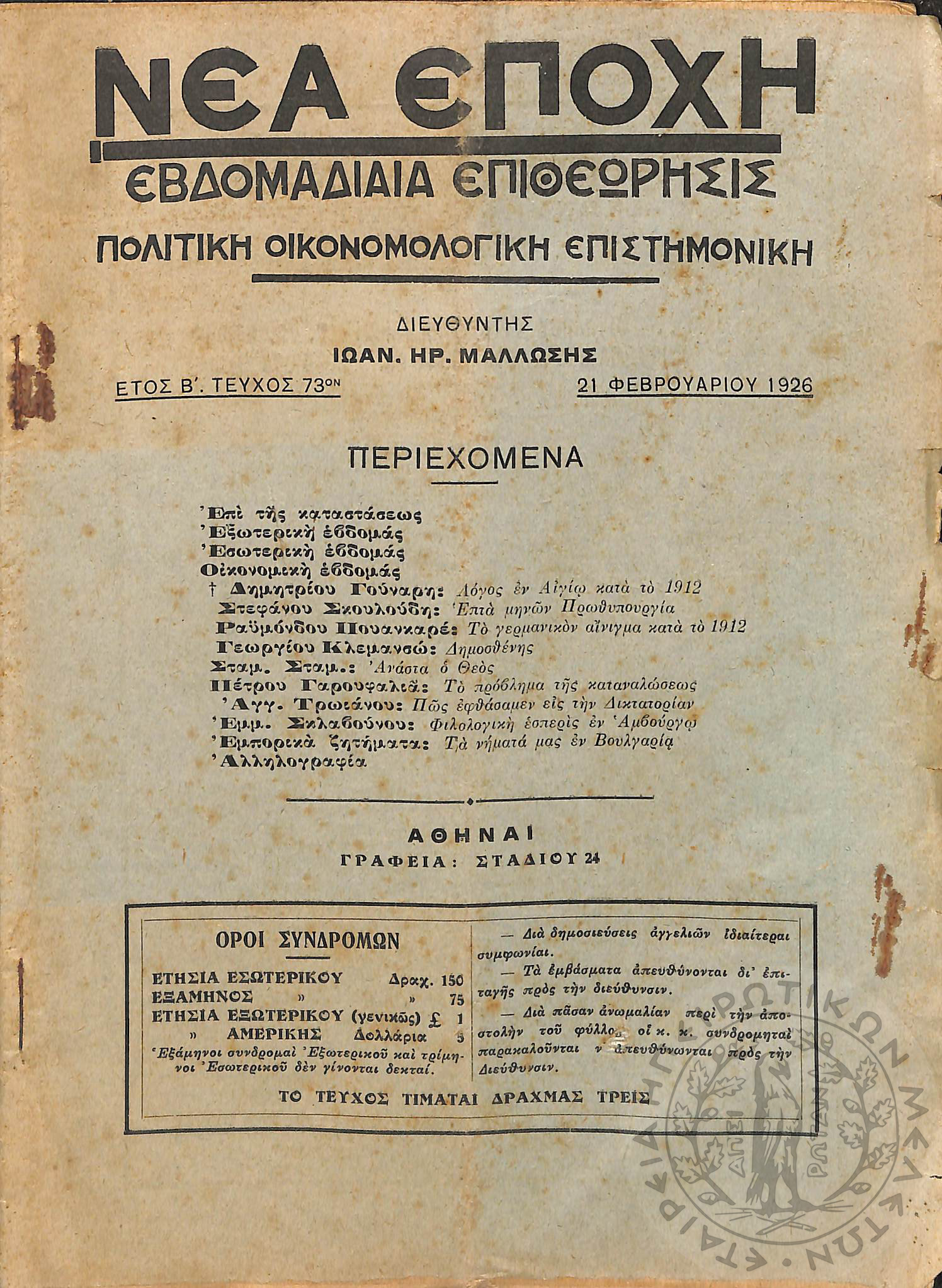 Νέα εποχή: εβδομαδιαία επιθεώρησις πολιτική, οικονομολογική, επιστημονική (τεύχ. 73)Έτος Β΄, τεύχ. 73...