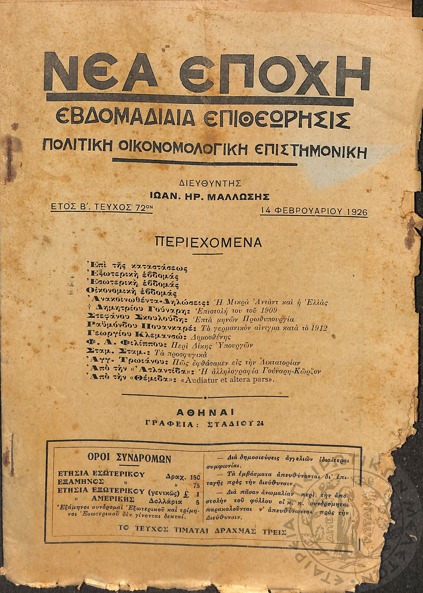 Νέα εποχή: εβδομαδιαία επιθεώρησις πολιτική, οικονομολογική, επιστημονική (τεύχ. 72)Έτος Β΄, τεύχ. 72...