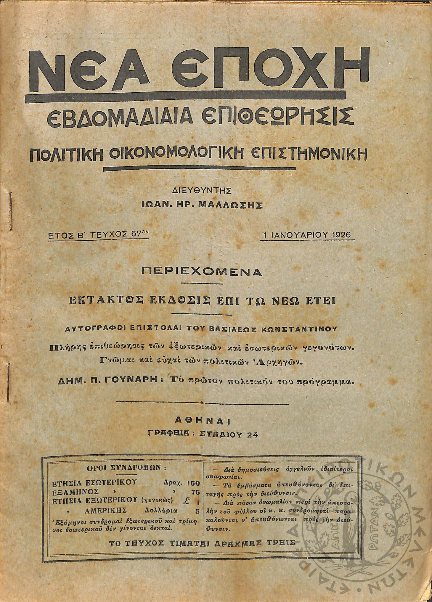 Νέα εποχή: εβδομαδιαία επιθεώρησις πολιτική, οικονομολογική, επιστημονική (τεύχ. 67)Έτος Β΄, τεύχ. 67...