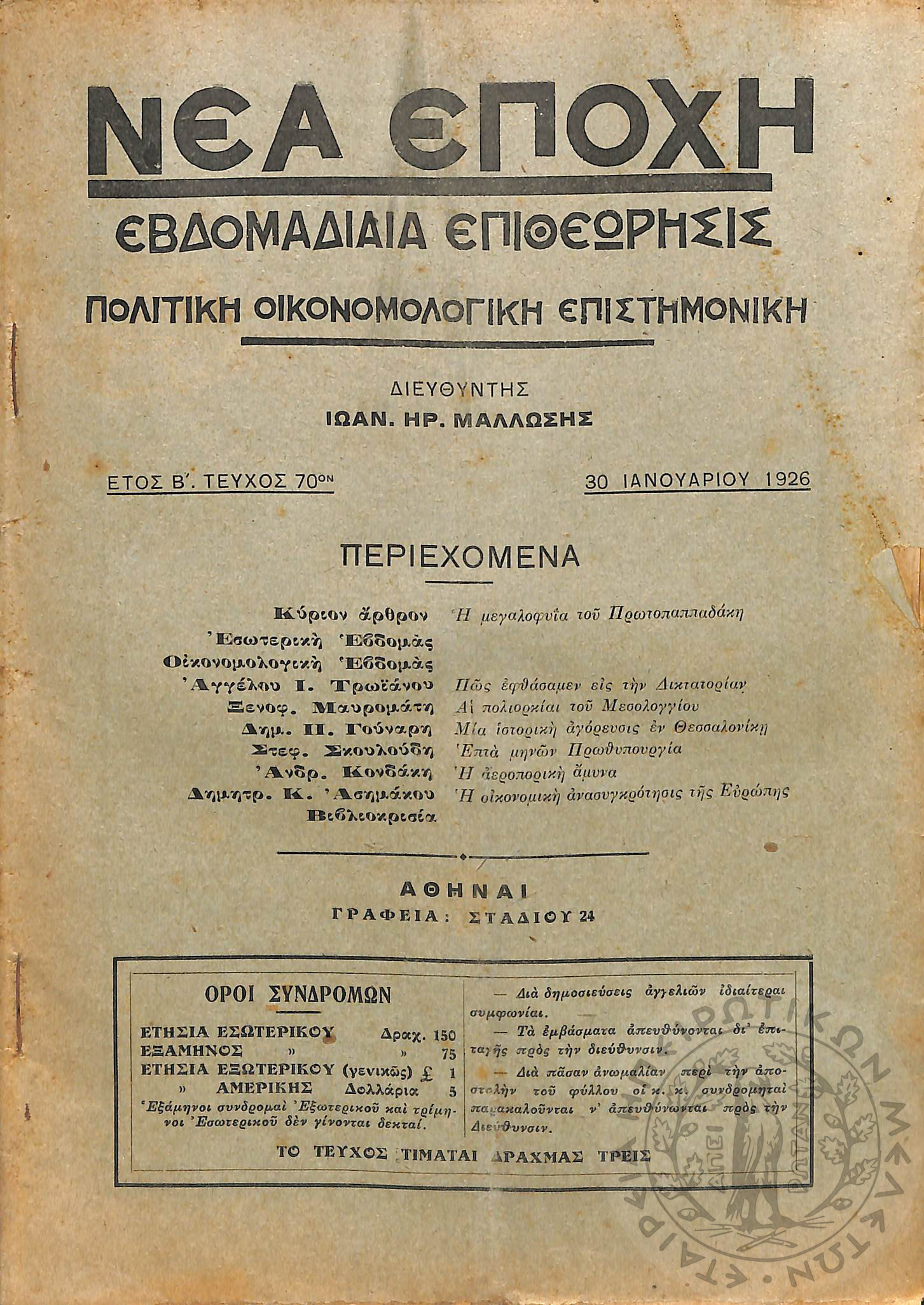 Νέα εποχή: εβδομαδιαία επιθεώρησις πολιτική, οικονομολογική, επιστημονική (τεύχ. 70)Έτος Β΄, τεύχ. 70...