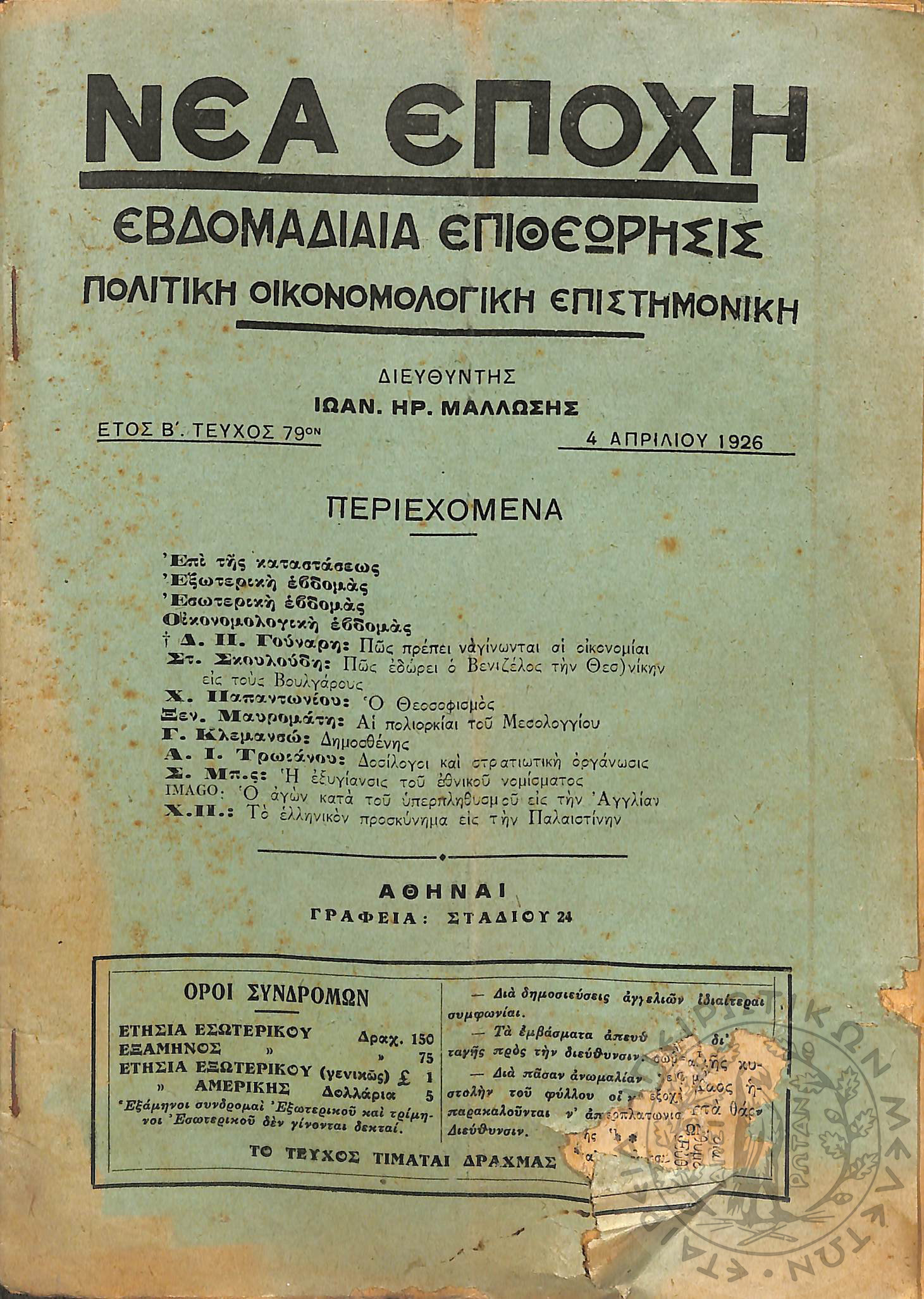 Νέα εποχή: εβδομαδιαία επιθεώρησις πολιτική, οικονομολογική, επιστημονική (τεύχ. 79)Έτος Β΄, τεύχ. 79...