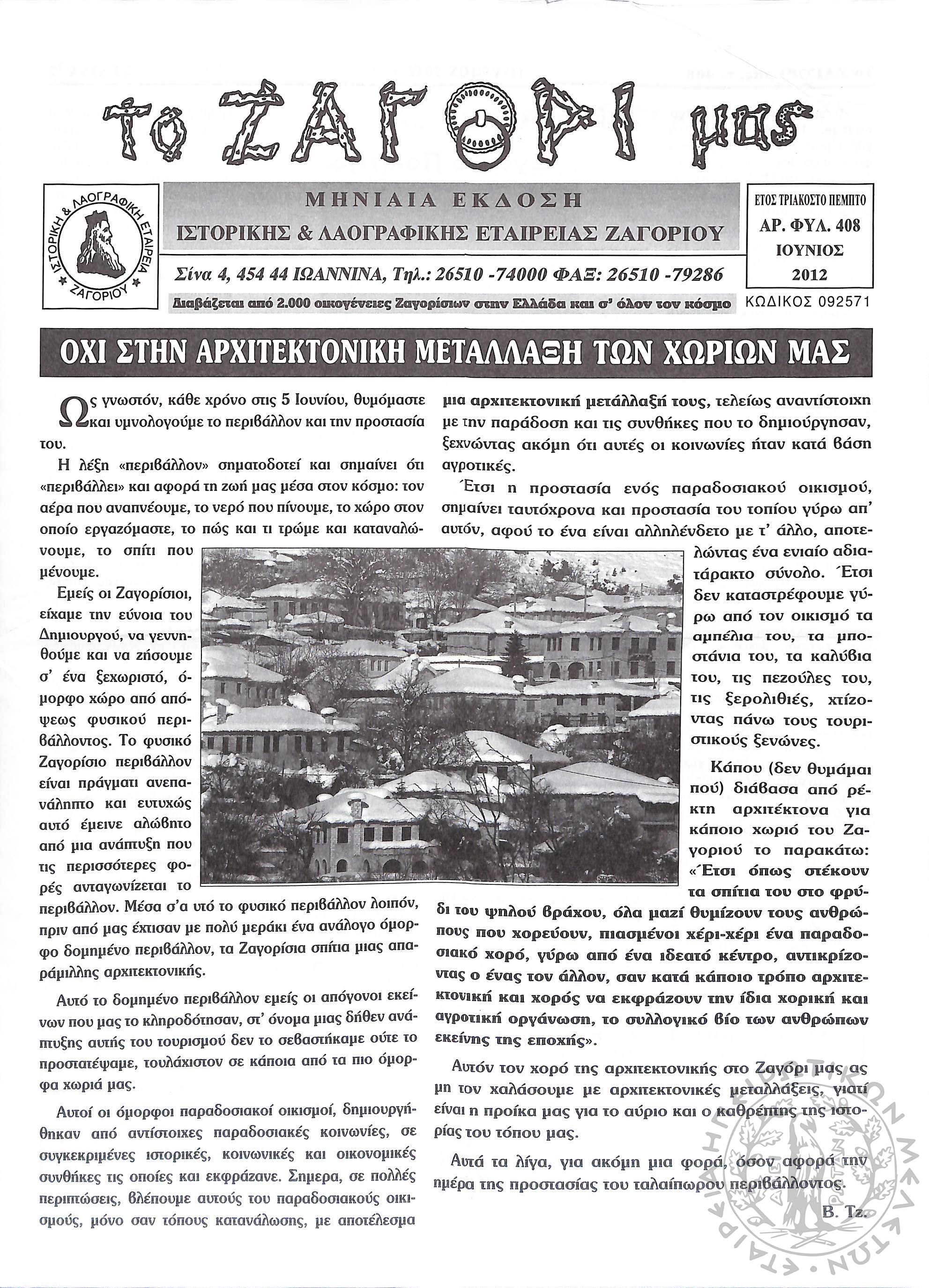 Το Ζαγόρι μας: μηνιαία έκδοση Ιστορικής και Λαογραφικής Εταιρείας Ζαγορίου (φ. 408)Έτος 35, φ. 408...