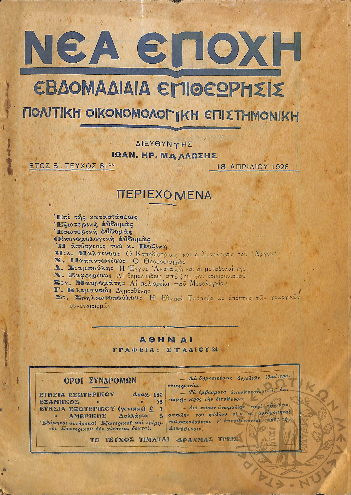 Νέα εποχή: εβδομαδιαία επιθεώρησις πολιτική, οικονομολογική, επιστημονική (τεύχ. 81)Έτος Β΄, τεύχ. 81...
