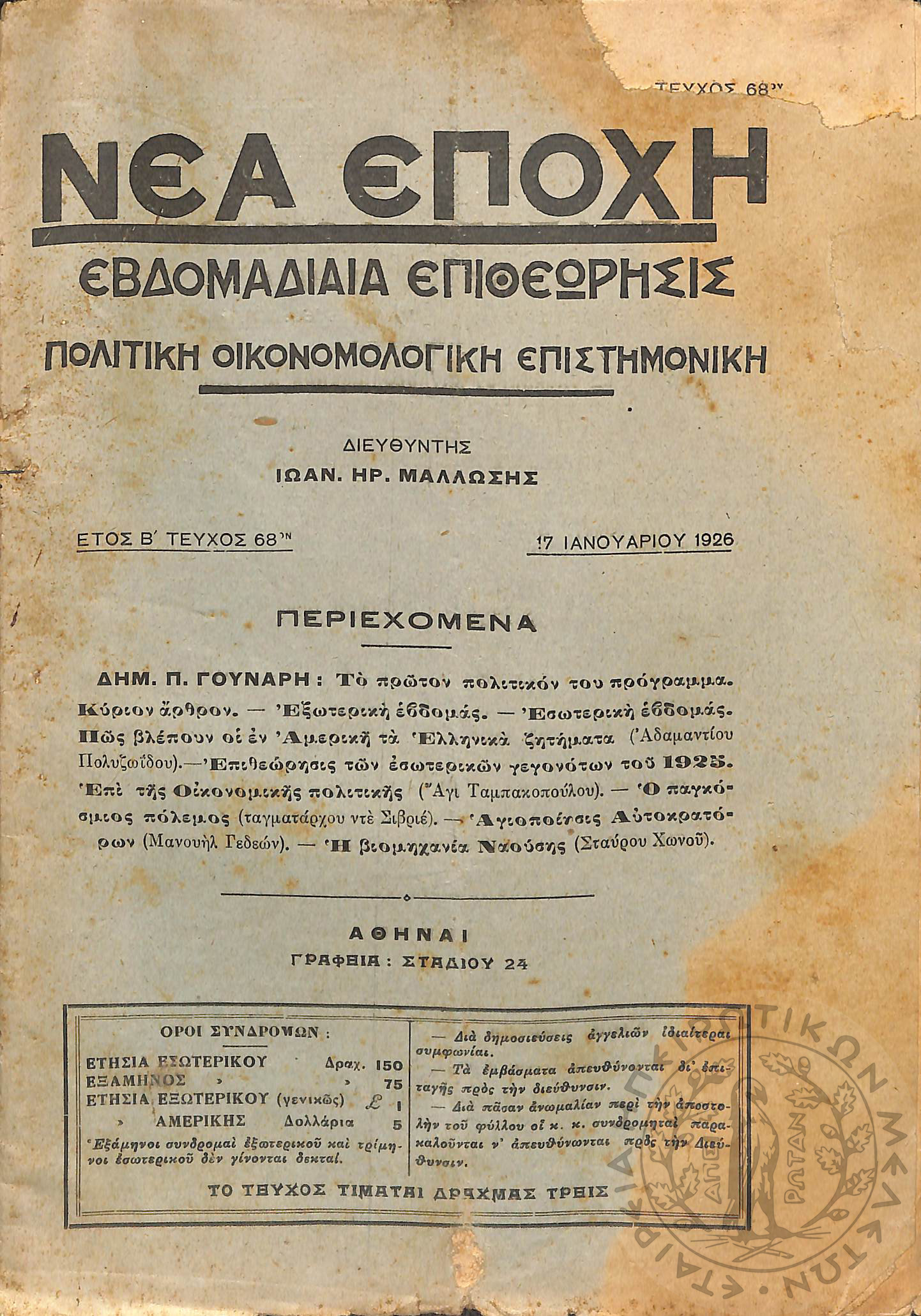 Νέα εποχή: εβδομαδιαία επιθεώρησις πολιτική, οικονομολογική, επιστημονική (τεύχ. 68)Έτος Β΄, τεύχ. 68...