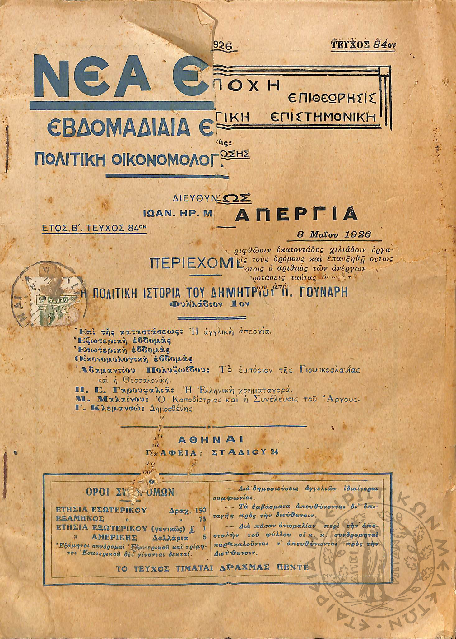 Νέα εποχή: εβδομαδιαία επιθεώρησις πολιτική, οικονομολογική, επιστημονική (τεύχ. 84)Έτος Β΄, τεύχ. 84...