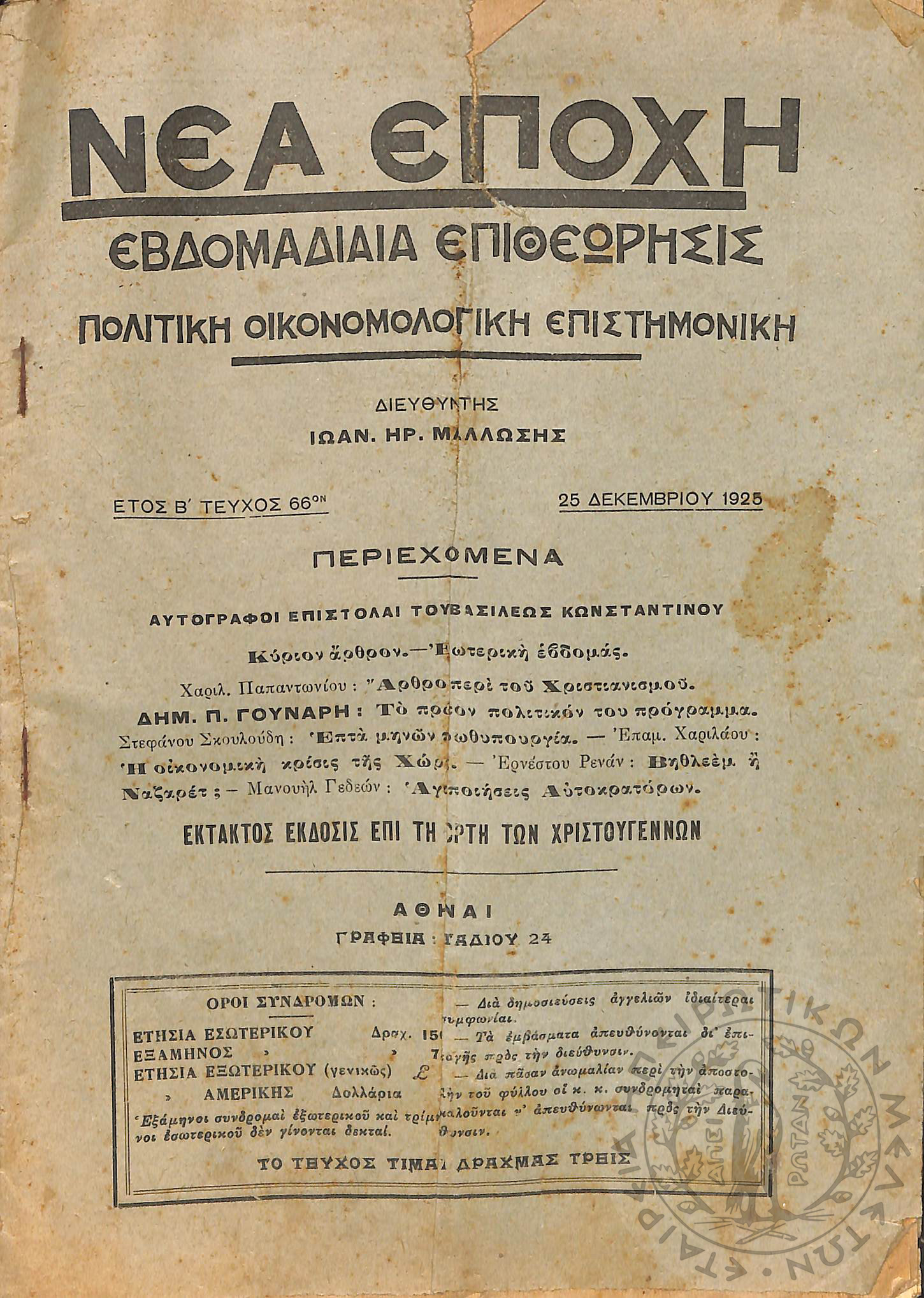 Νέα εποχή: εβδομαδιαία επιθεώρησις πολιτική, οικονομολογική, επιστημονική (τεύχ. 66)Έτος Β΄, τεύχ. 66...