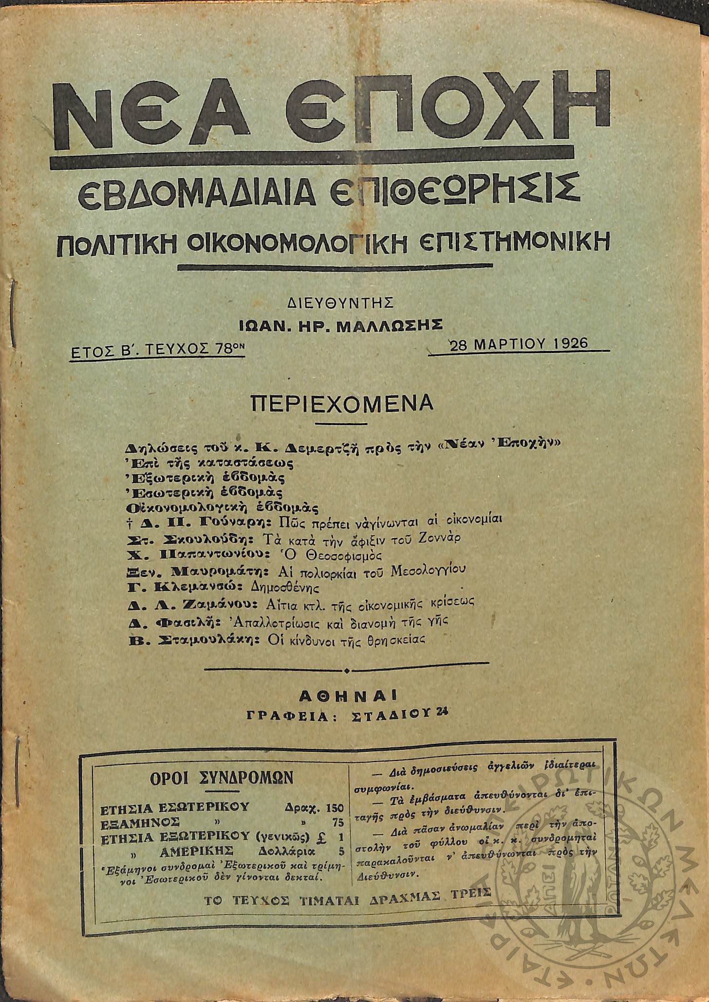 Νέα εποχή: εβδομαδιαία επιθεώρησις πολιτική, οικονομολογική, επιστημονική (τεύχ. 78)Έτος Β΄, τεύχ. 78...