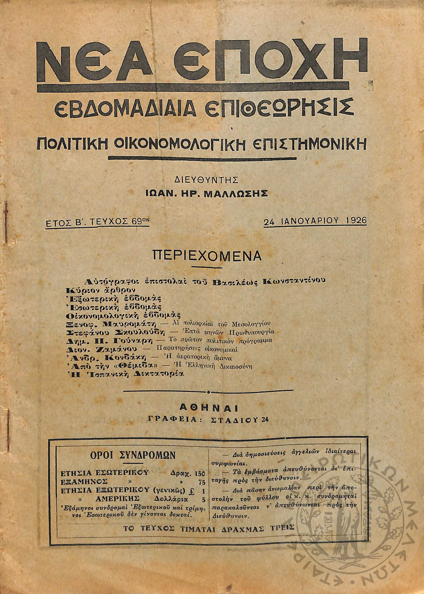 Νέα εποχή: εβδομαδιαία επιθεώρησις πολιτική, οικονομολογική, επιστημονική (τεύχ. 69)Έτος Β΄, τεύχ. 69...