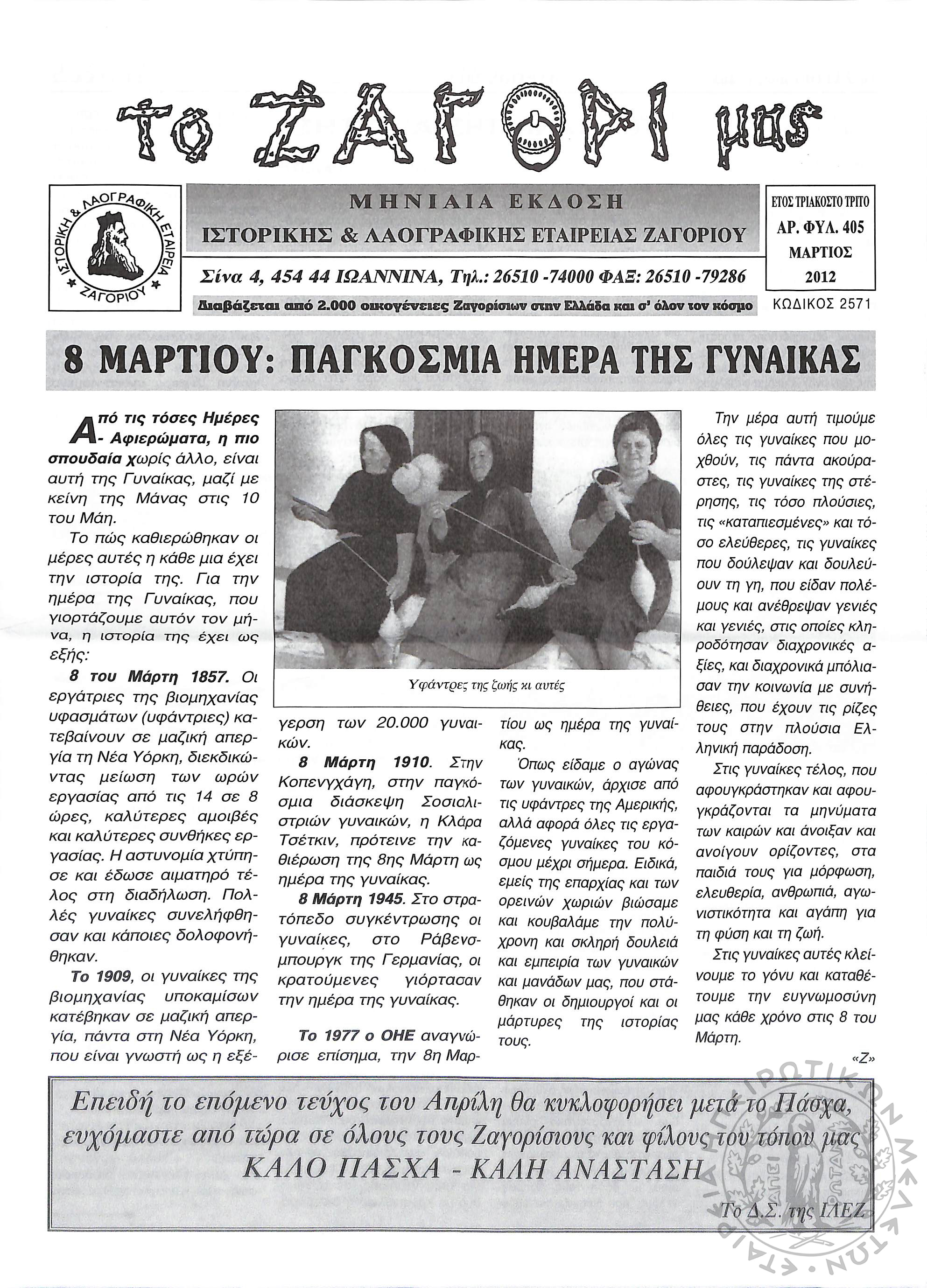 Το Ζαγόρι μας: μηνιαία έκδοση Ιστορικής και Λαογραφικής Εταιρείας Ζαγορίου (φ. 405)Έτος 33, φ. 405...