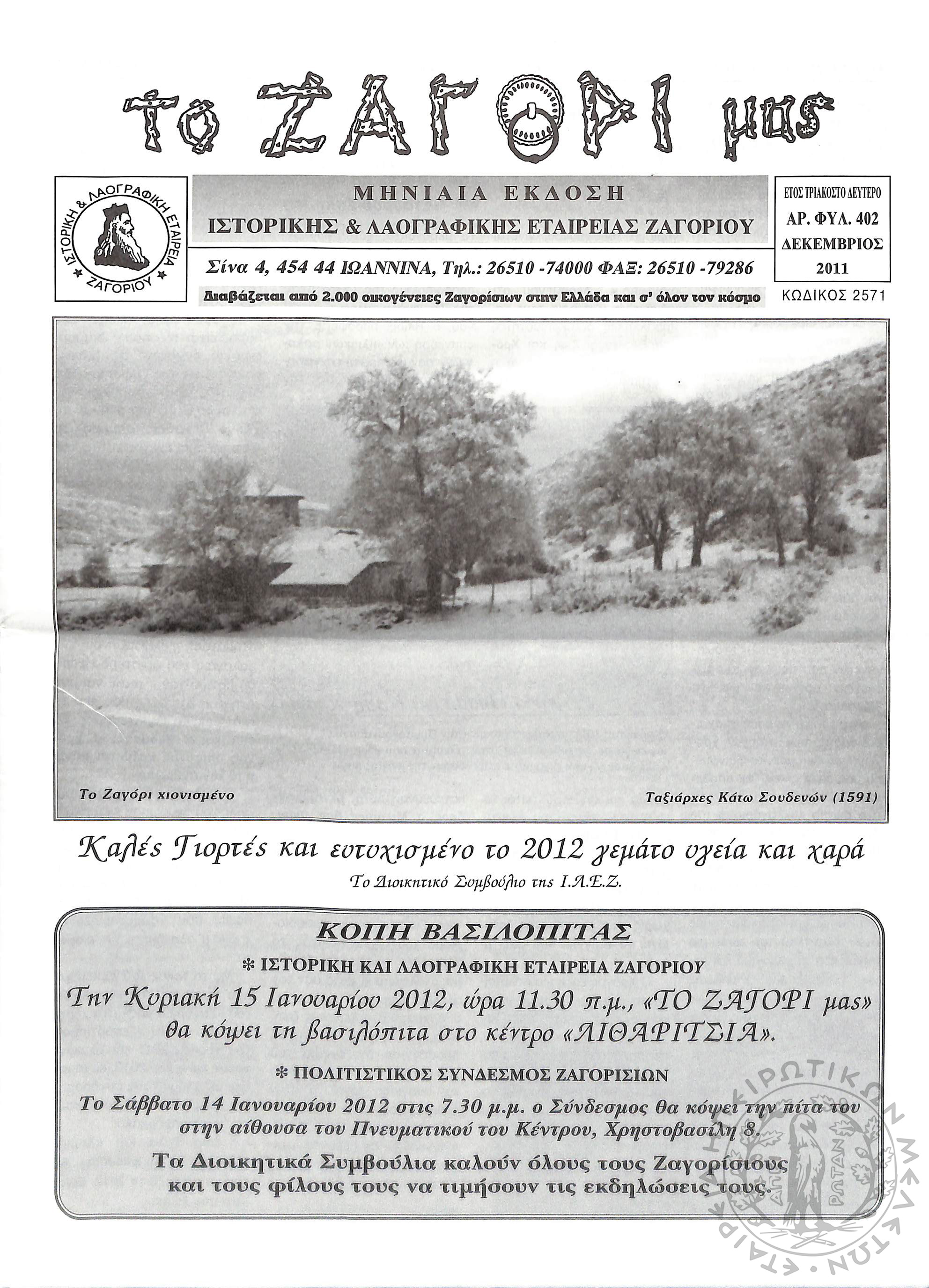 Το Ζαγόρι μας: μηνιαία έκδοση Ιστορικής και Λαογραφικής Εταιρείας Ζαγορίου (φ. 402)Έτος 32, φ. 402...