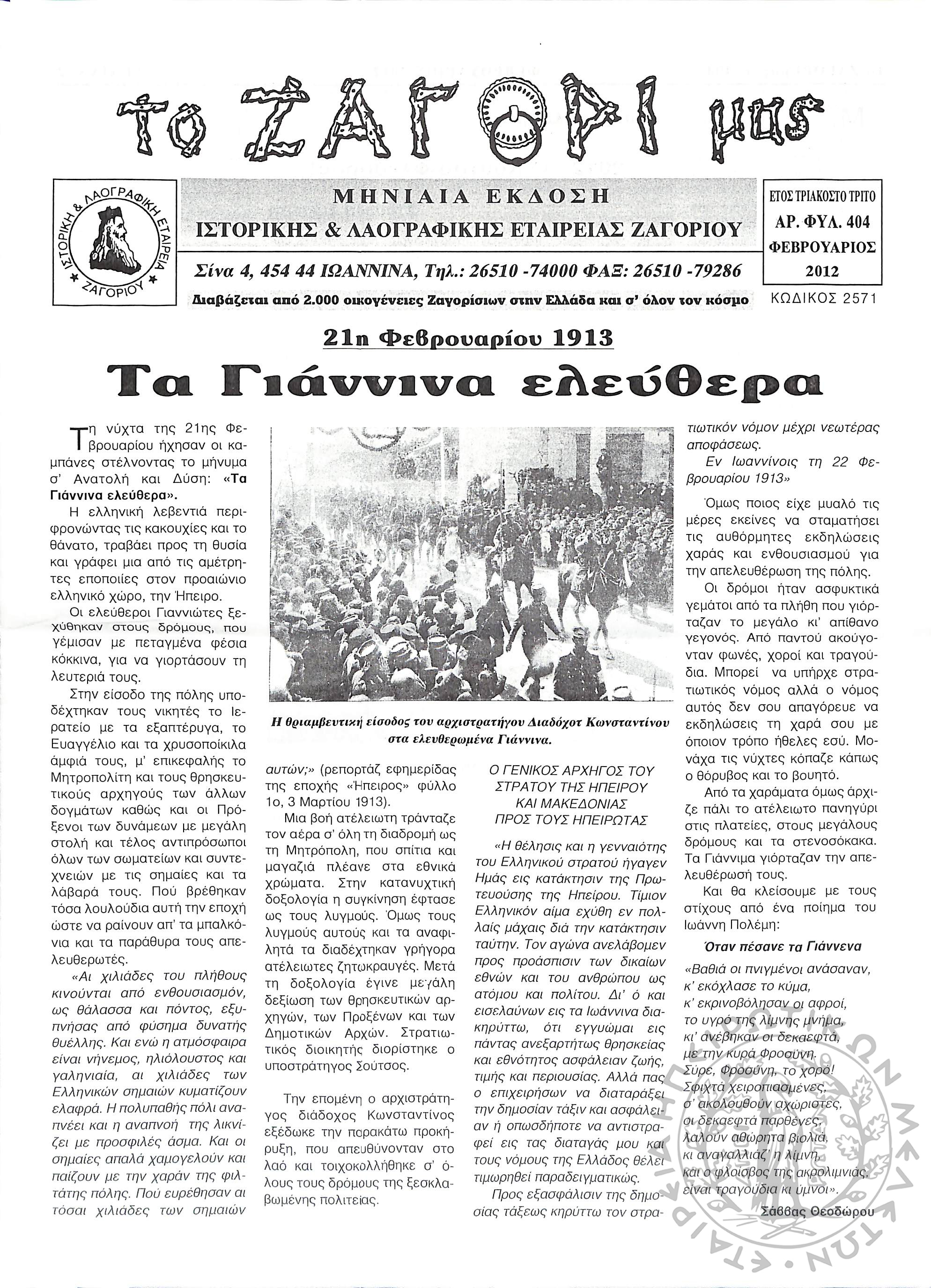 Το Ζαγόρι μας: μηνιαία έκδοση Ιστορικής και Λαογραφικής Εταιρείας Ζαγορίου (φ. 404)Έτος 33, φ. 404...