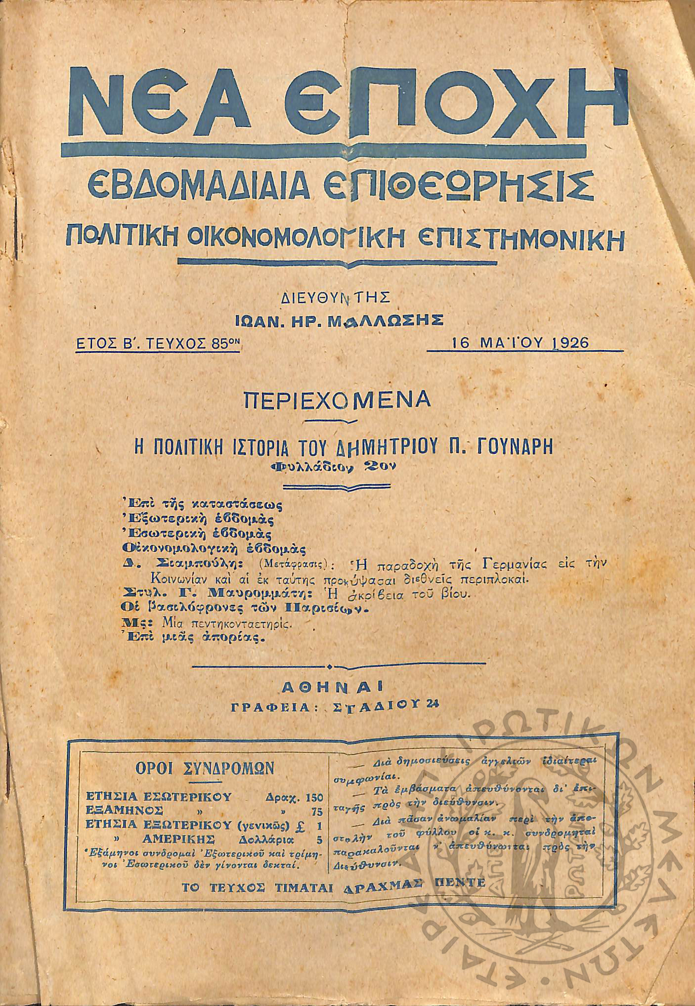 Νέα εποχή: εβδομαδιαία επιθεώρησις πολιτική, οικονομολογική, επιστημονική (τεύχ. 85)Έτος Β΄, τεύχ. 85...