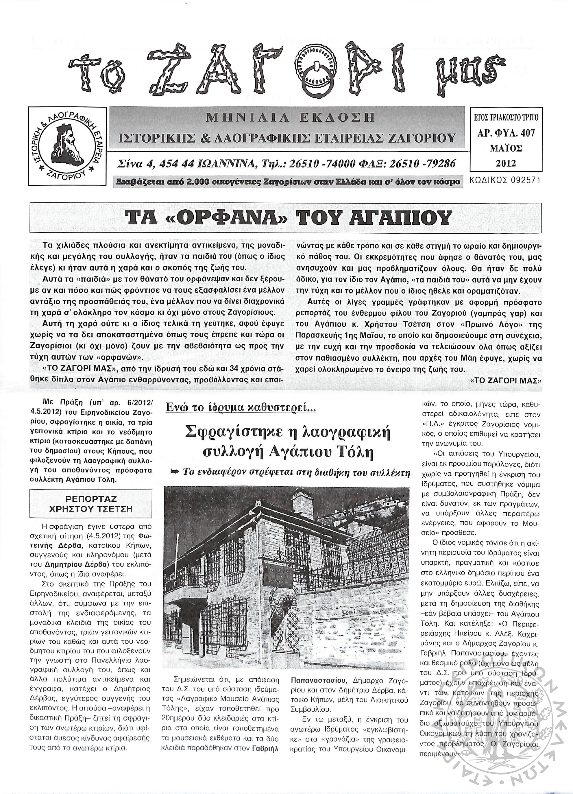 Το Ζαγόρι μας: μηνιαία έκδοση Ιστορικής και Λαογραφικής Εταιρείας Ζαγορίου (φ. 407)Έτος 33, φ. 407...