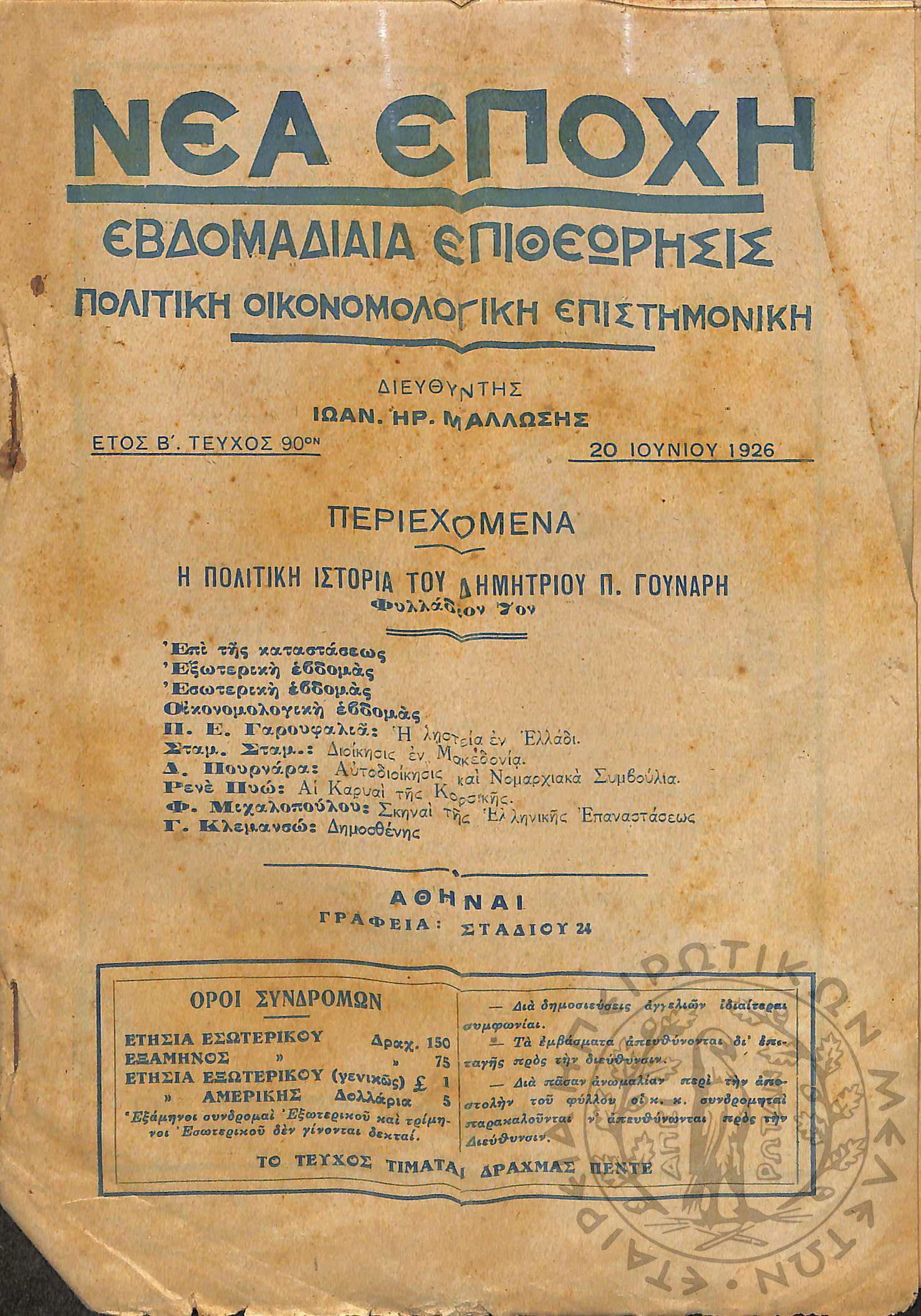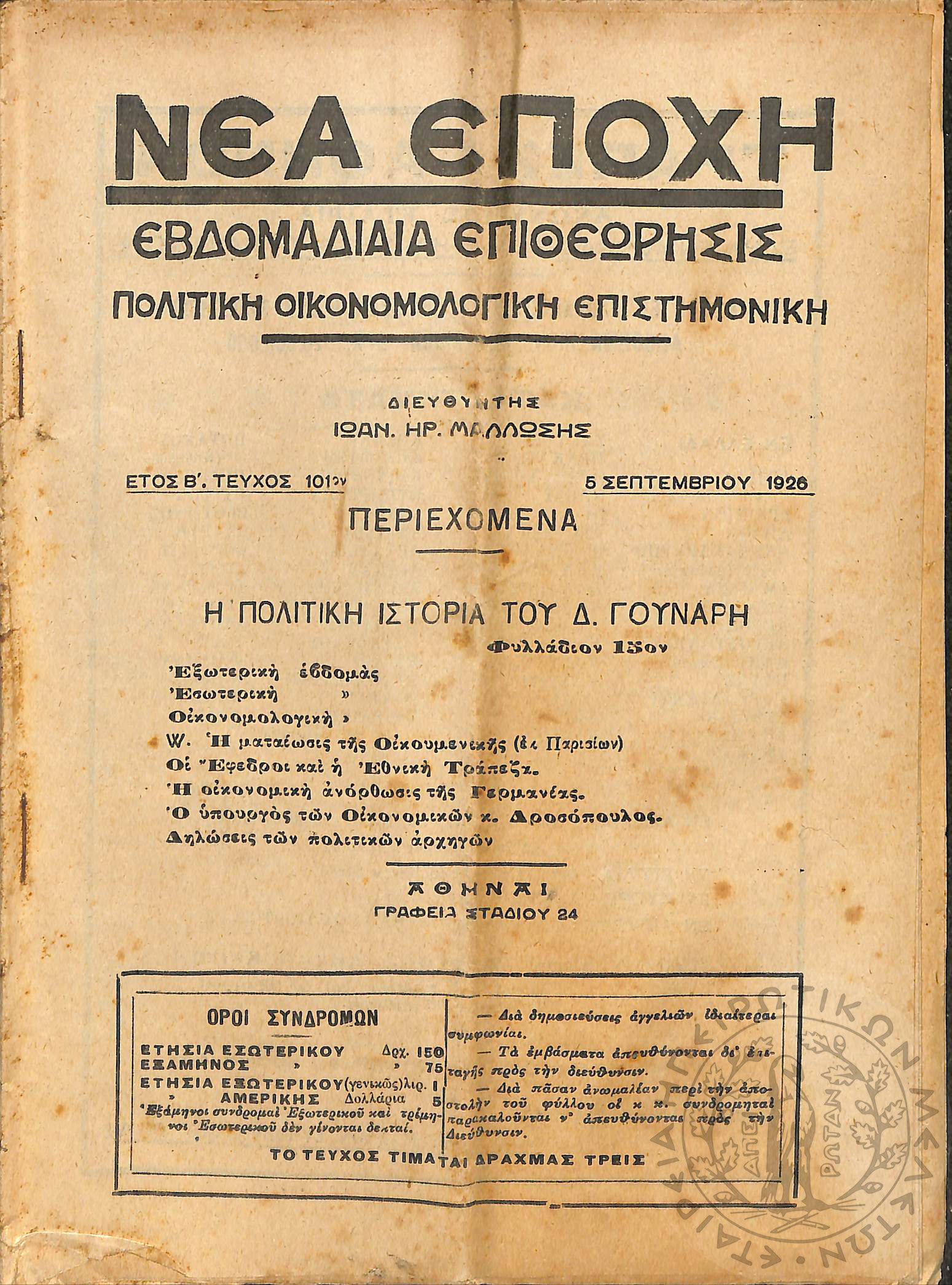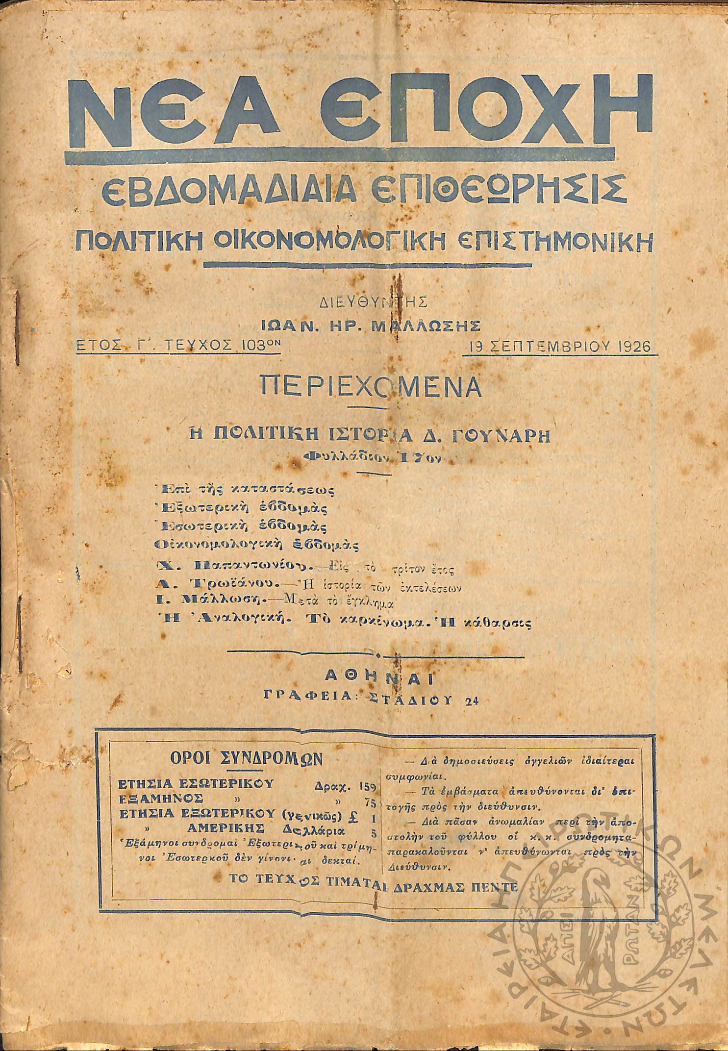 Νέα εποχή: εβδομαδιαία επιθεώρησις πολιτική, οικονομολογική, επιστημονική (τεύχ. 103)Έτος Γ΄, τεύχ. 103...