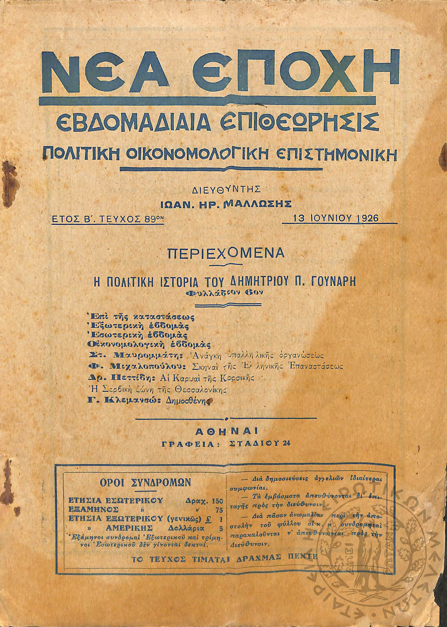 Νέα εποχή: εβδομαδιαία επιθεώρησις πολιτική, οικονομολογική, επιστημονική (τεύχ. 89)Έτος Β΄, τεύχ. 89...