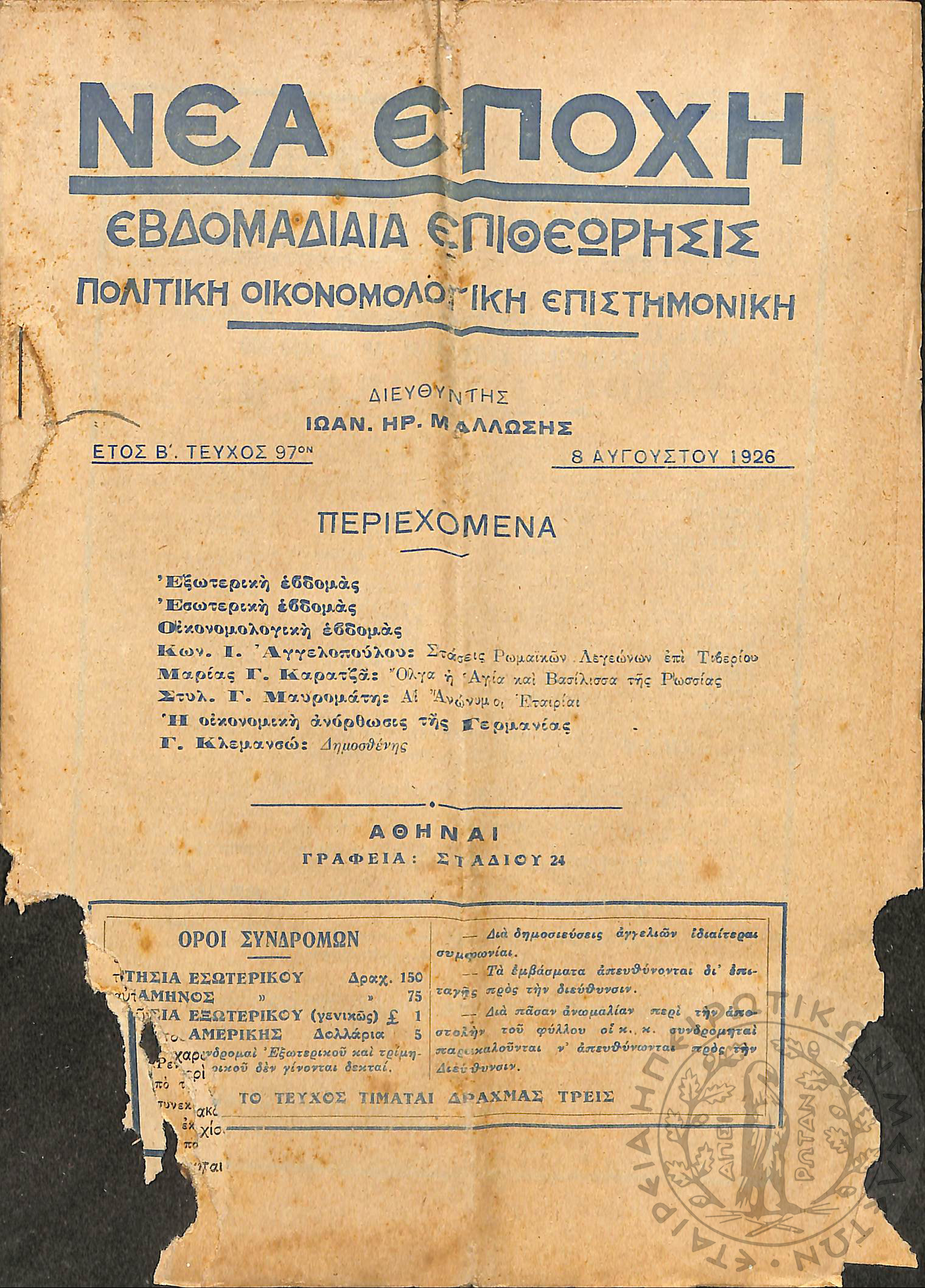 Νέα εποχή: εβδομαδιαία επιθεώρησις πολιτική, οικονομολογική, επιστημονική (τεύχ. 97)Έτος Β΄, τεύχ. 97...