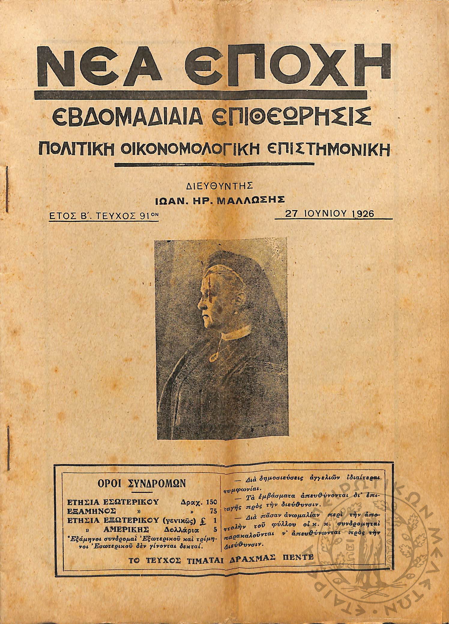 Νέα εποχή: εβδομαδιαία επιθεώρησις πολιτική, οικονομολογική, επιστημονική (τεύχ. 91)Έτος Β΄, τεύχ. 91...