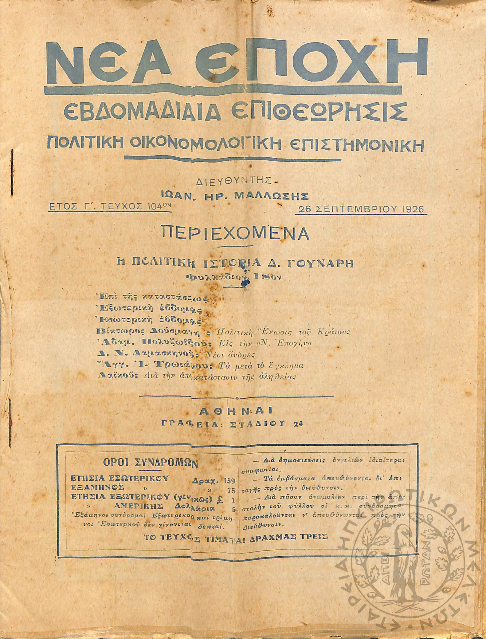 Νέα εποχή: εβδομαδιαία επιθεώρησις πολιτική, οικονομολογική, επιστημονική (τεύχ. 104)Έτος Γ΄, τεύχ. 104...