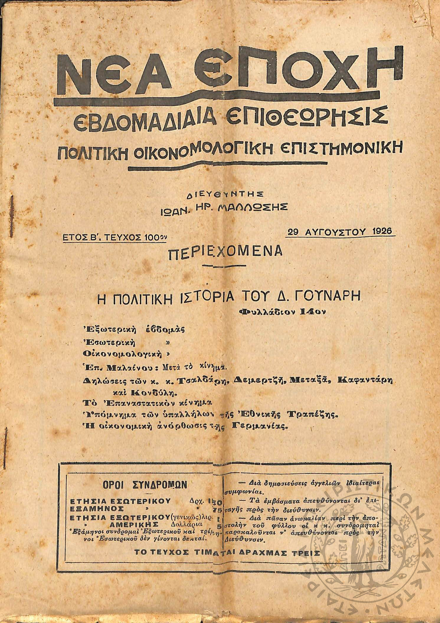 Νέα εποχή: εβδομαδιαία επιθεώρησις πολιτική, οικονομολογική, επιστημονική (τεύχ. 100)Έτος Β΄, τεύχ. 100...