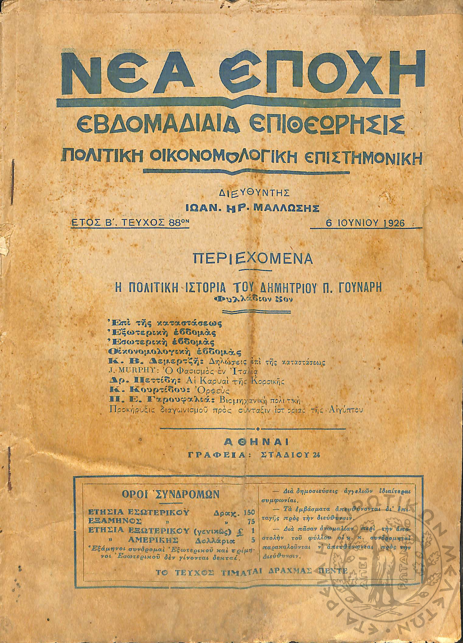 Νέα εποχή: εβδομαδιαία επιθεώρησις πολιτική, οικονομολογική, επιστημονική (τεύχ. 88)Έτος Β΄ τεύχ. 88...