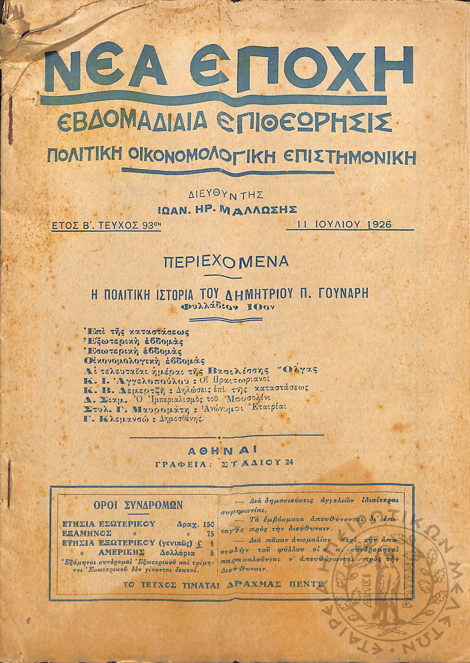 Νέα εποχή: εβδομαδιαία επιθεώρησις πολιτική, οικονομολογική, επιστημονική (τεύχ. 93)Έτος Β΄, τεύχ. 93...