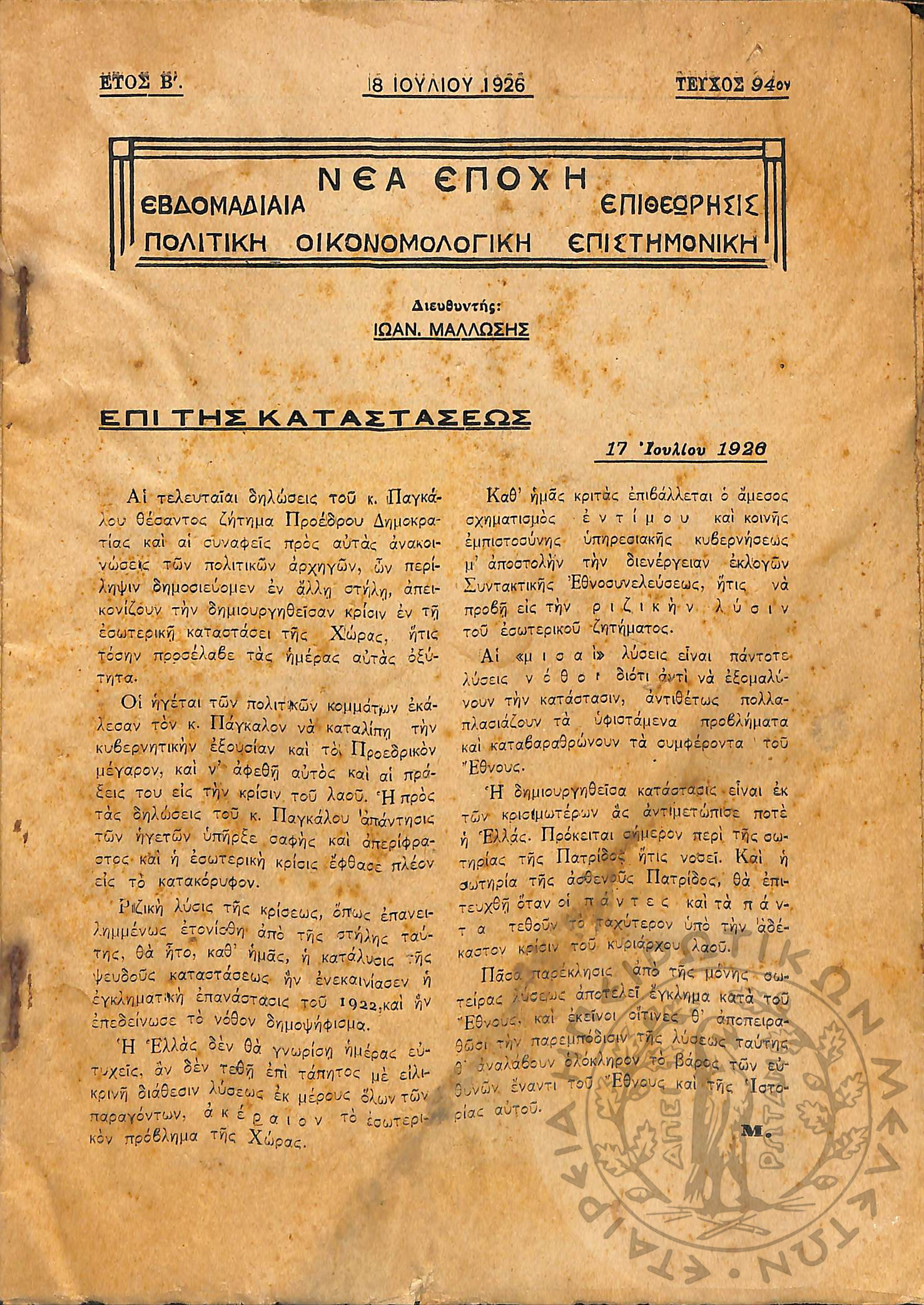 Νέα εποχή: εβδομαδιαία επιθεώρησις πολιτική, οικονομολογική, επιστημονική (τεύχ. 94)Έτος Β΄, τεύχ. 94...