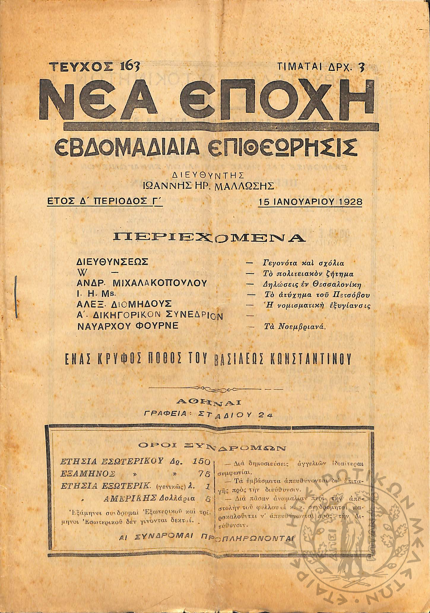 Νέα εποχή: εβδομαδιαία επιθεώρησις πολιτική, οικονομολογική, επιστημονική (τεύχ. 163)Έτος Δ΄, τεύχ. 163...