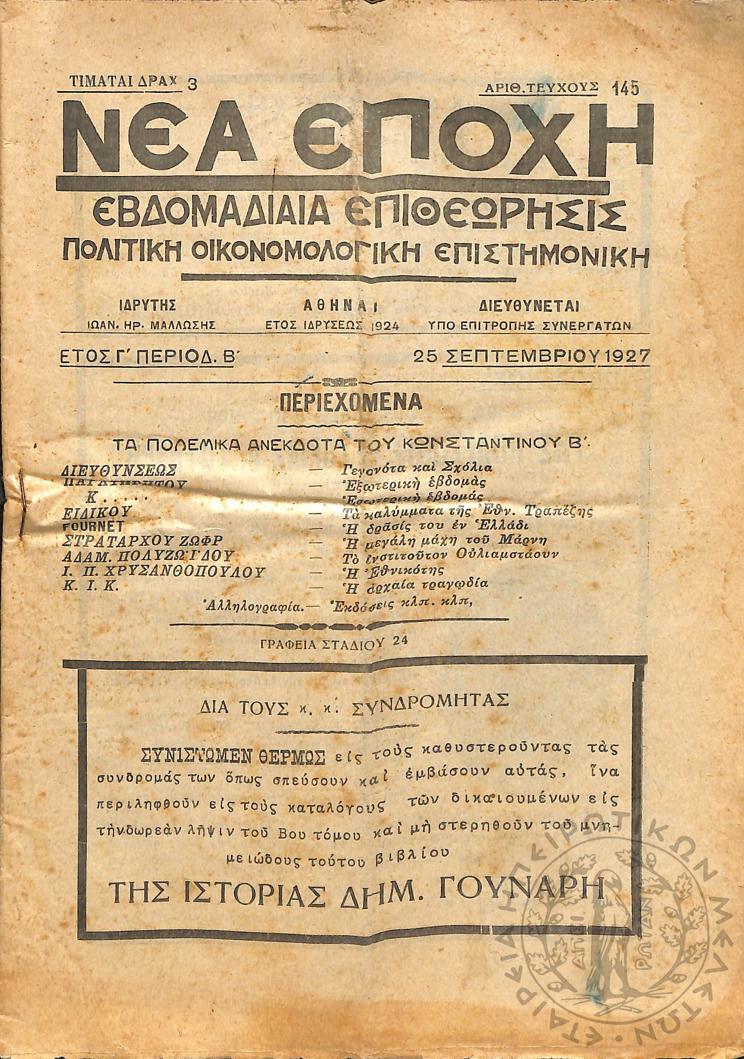 Νέα εποχή: εβδομαδιαία επιθεώρησις πολιτική, οικονομολογική, επιστημονική (τεύχ. 145)Έτος Γ΄, τεύχ. 145...