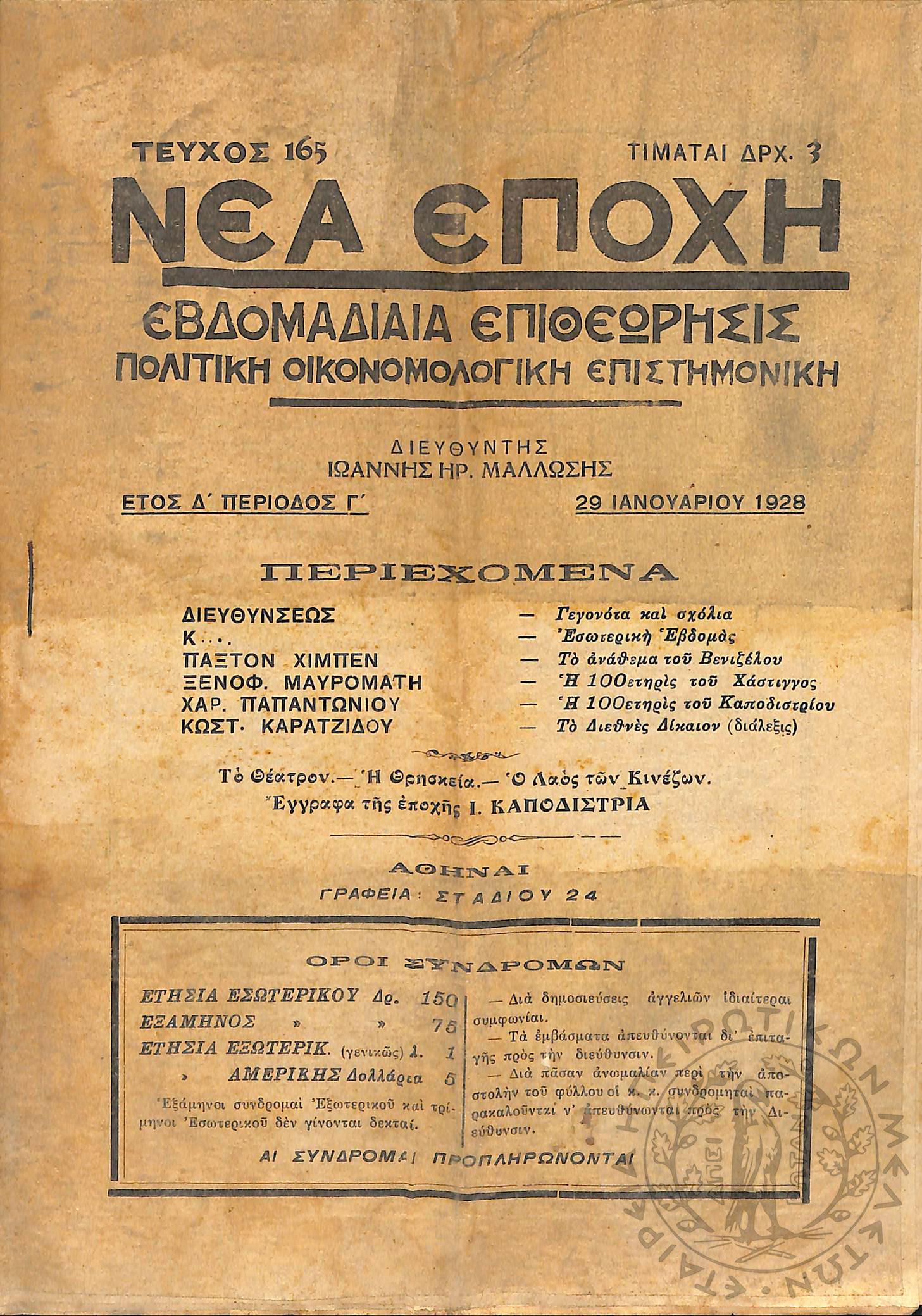 Νέα εποχή: εβδομαδιαία επιθεώρησις πολιτική, οικονομολογική, επιστημονική (τεύχ. 165)Έτος Δ΄, τεύχ. 165...
